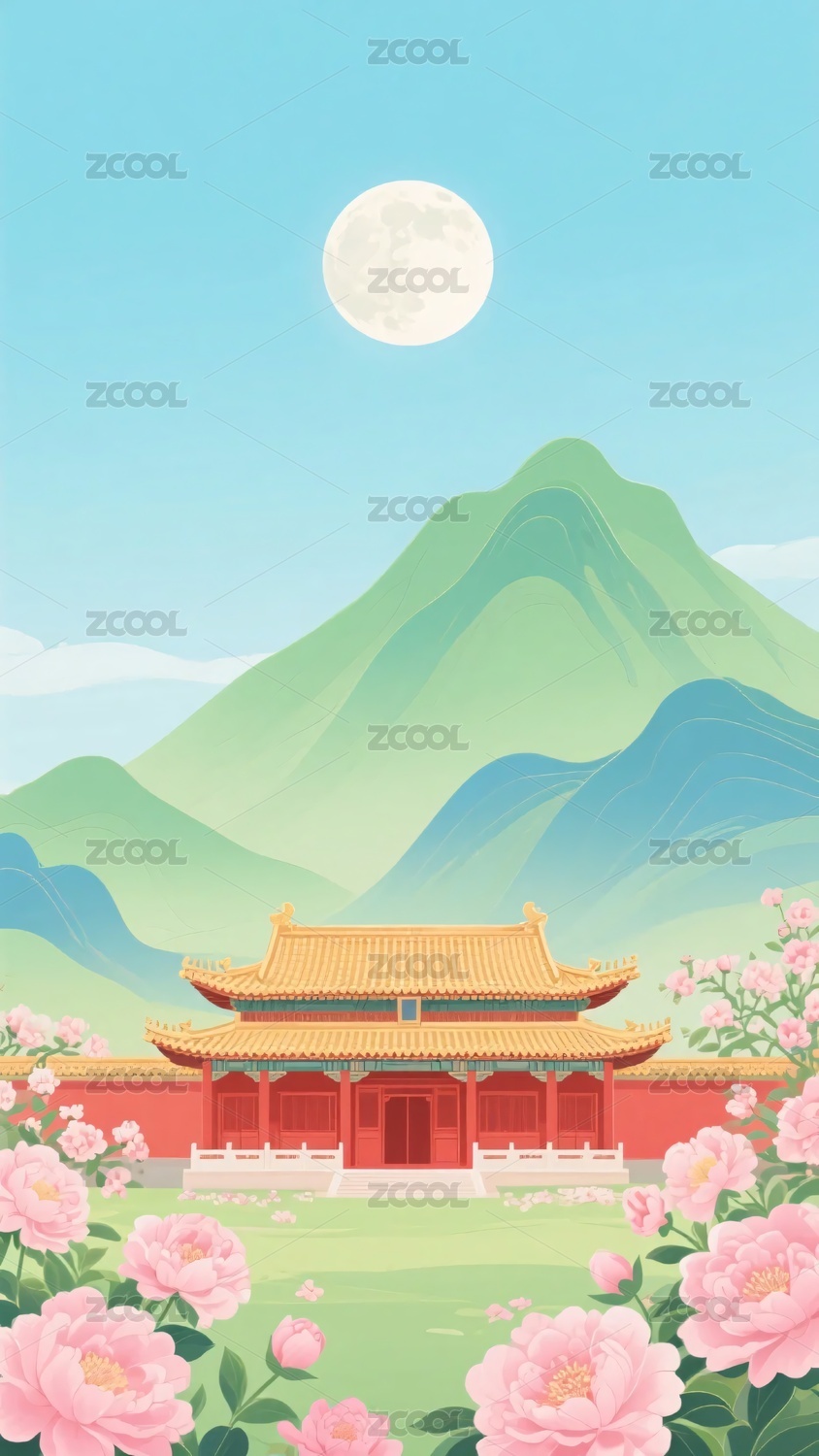 宫殿,樱花,山水,月亮,插画,风景,古风,矢量,画面元素,主题