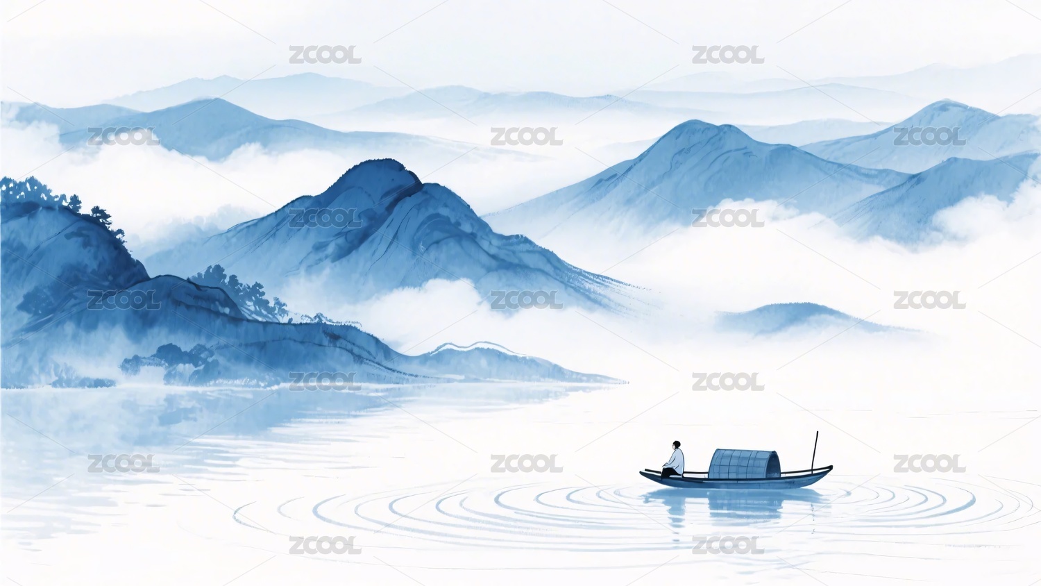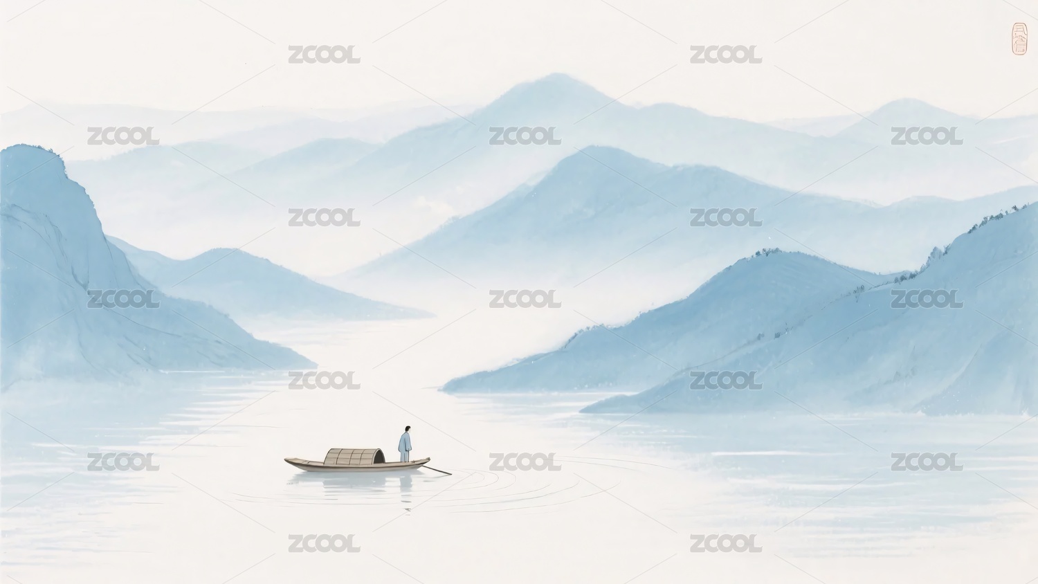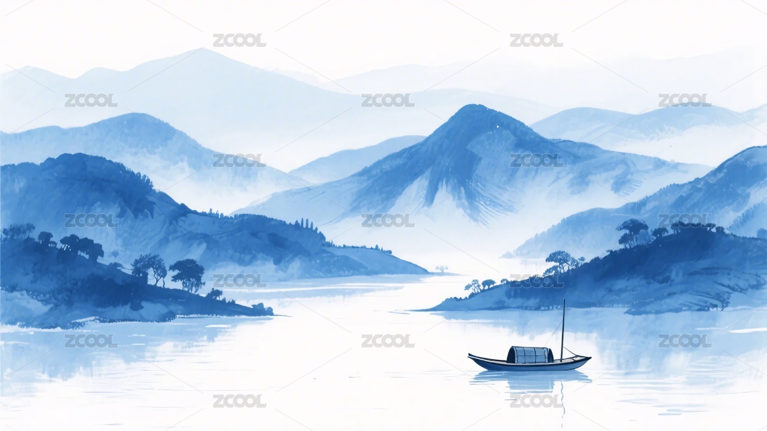 山水,孤舟,意境,插画,自然,宁静,淡雅,水墨画,风景,小船