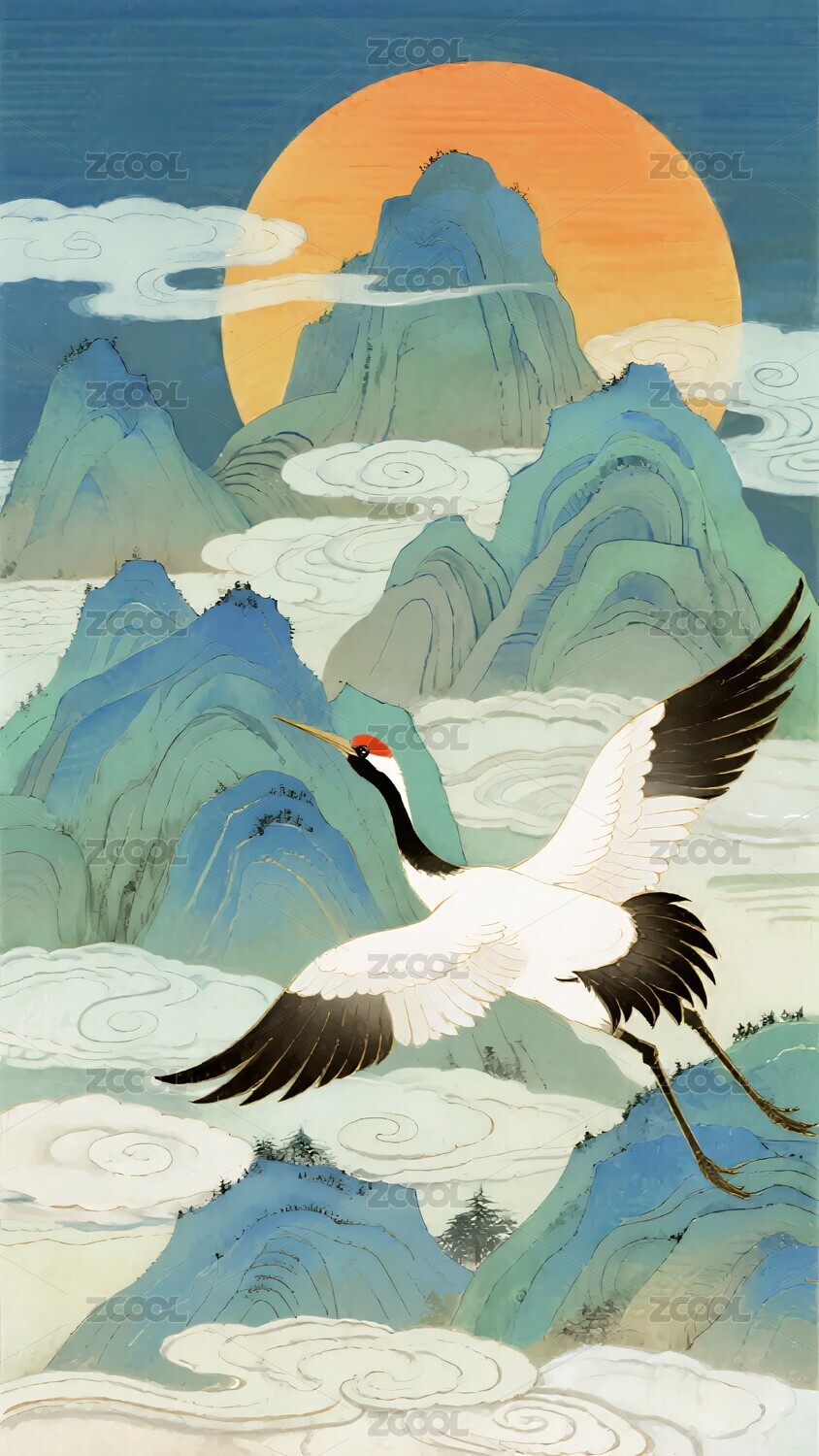 仙鹤,菊花,落日,山水,插画,画面元素,自然,飞鸟,花卉,风景