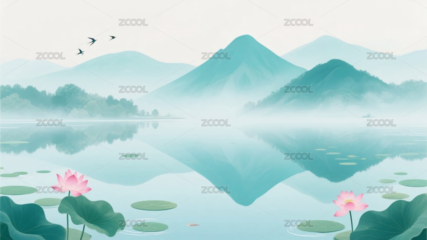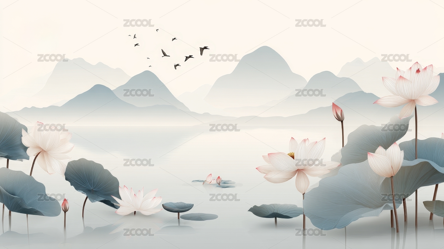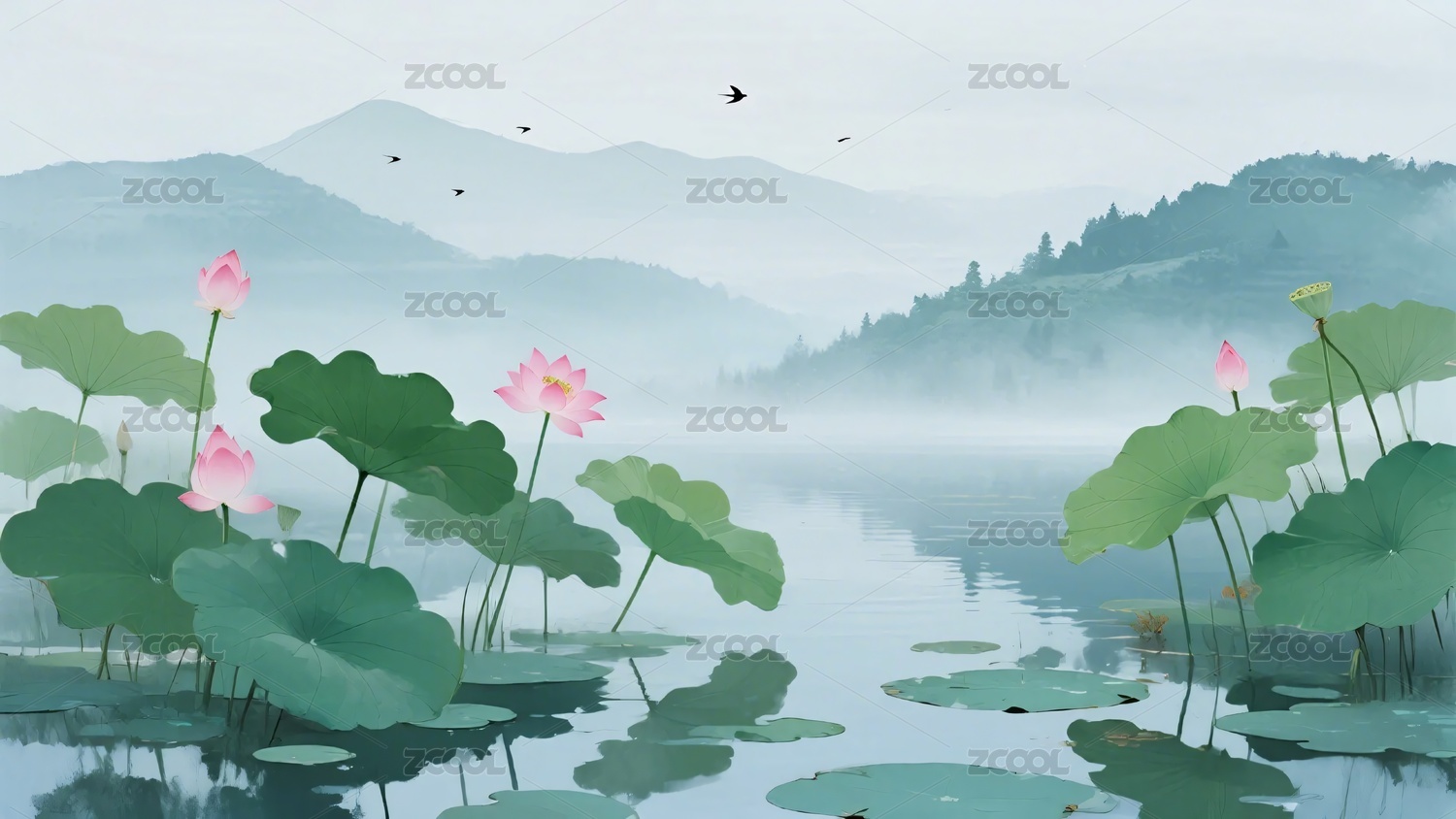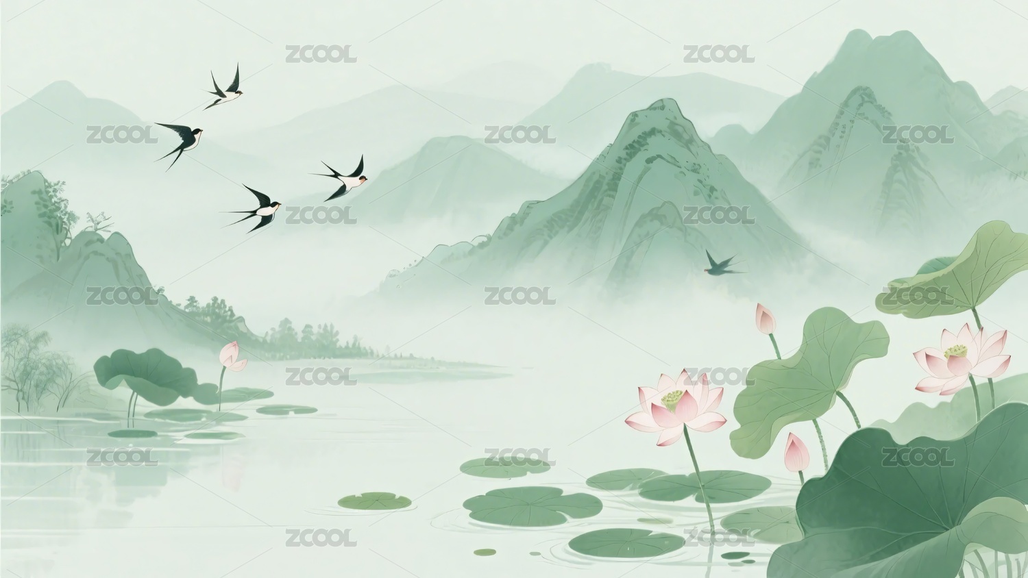 水墨风山水荷塘飞鸟图景