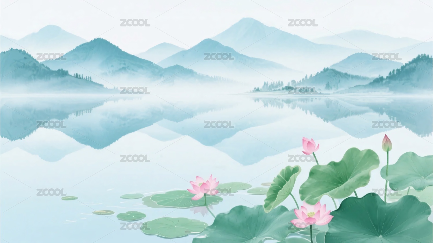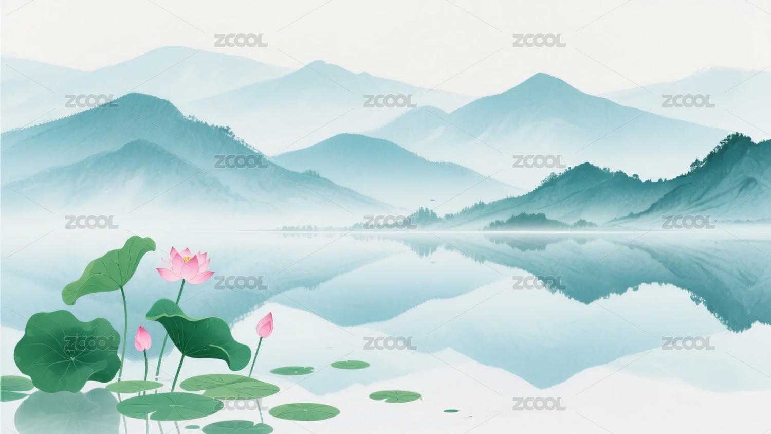 水墨风湖面荷花山水图景