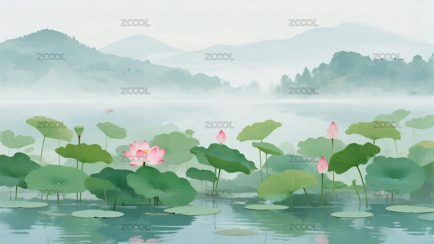 山水荷塘意境插画