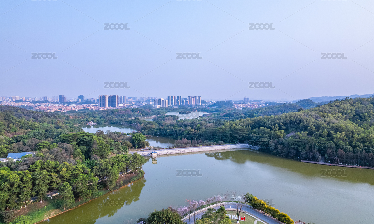 广州大夫山森林公园七盏灯山塘树林湖景航拍