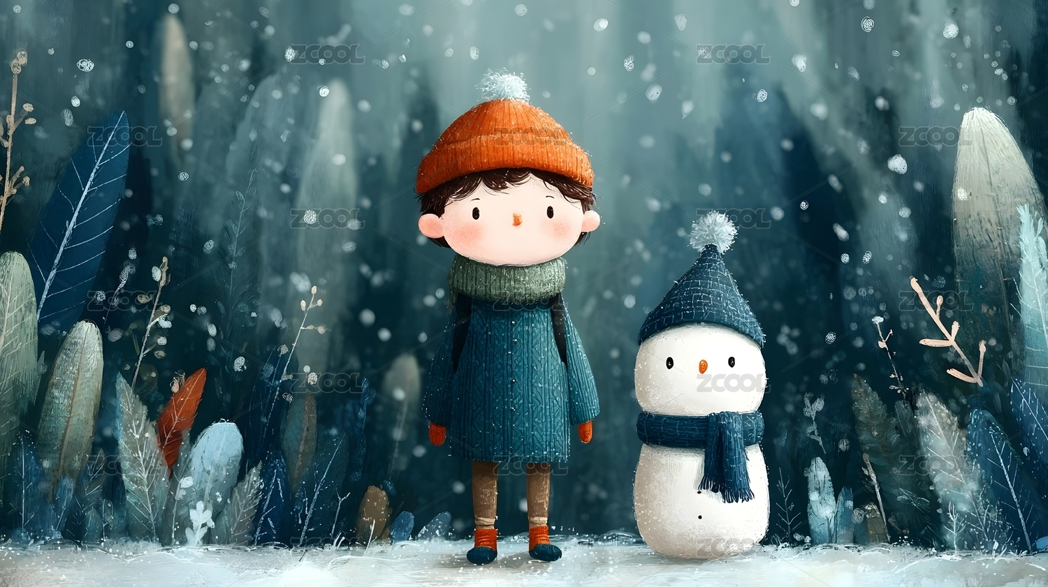 小女孩开心地在飘落的秋叶和雪花中玩耍
