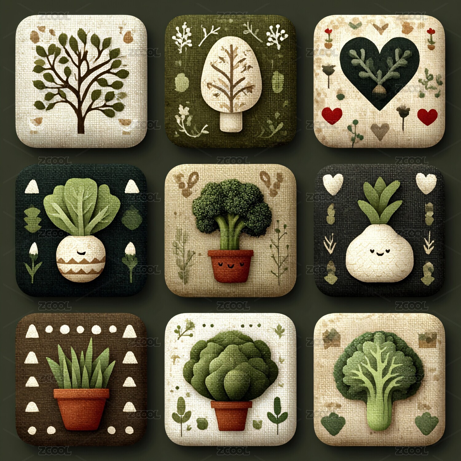 手绘植物图案方形插画集合
