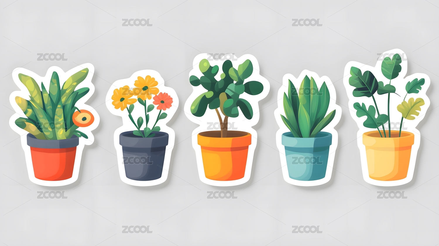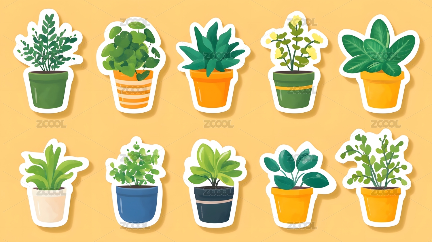 白色背景下盆栽和绿植的贴纸