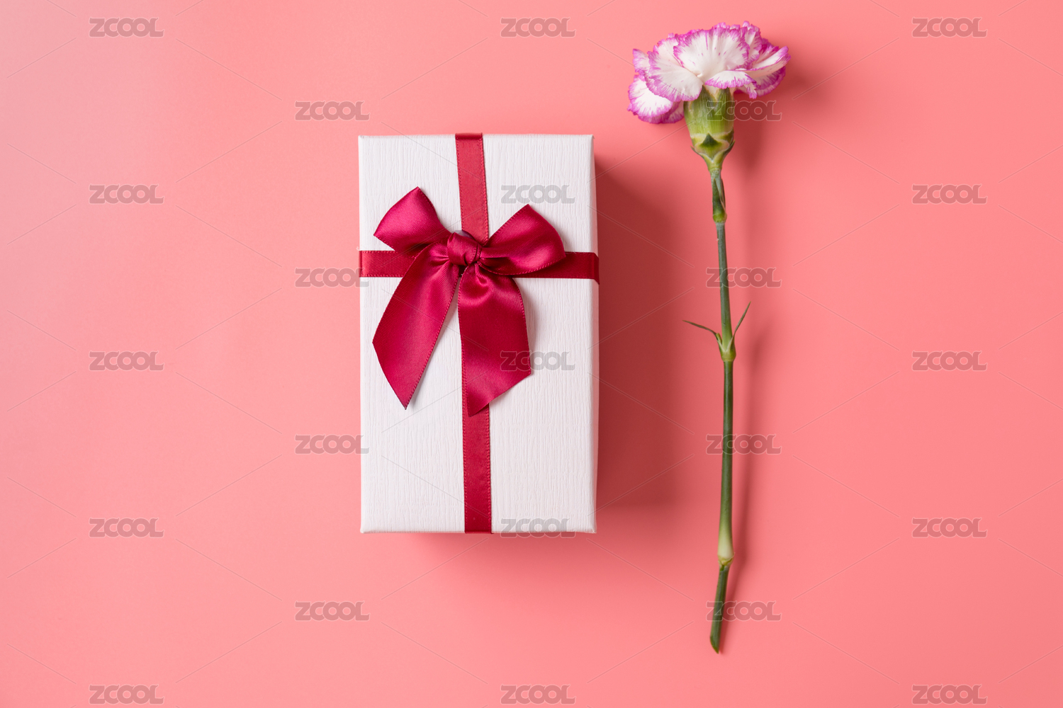 粉色背景上的礼物盒和一枝康乃馨