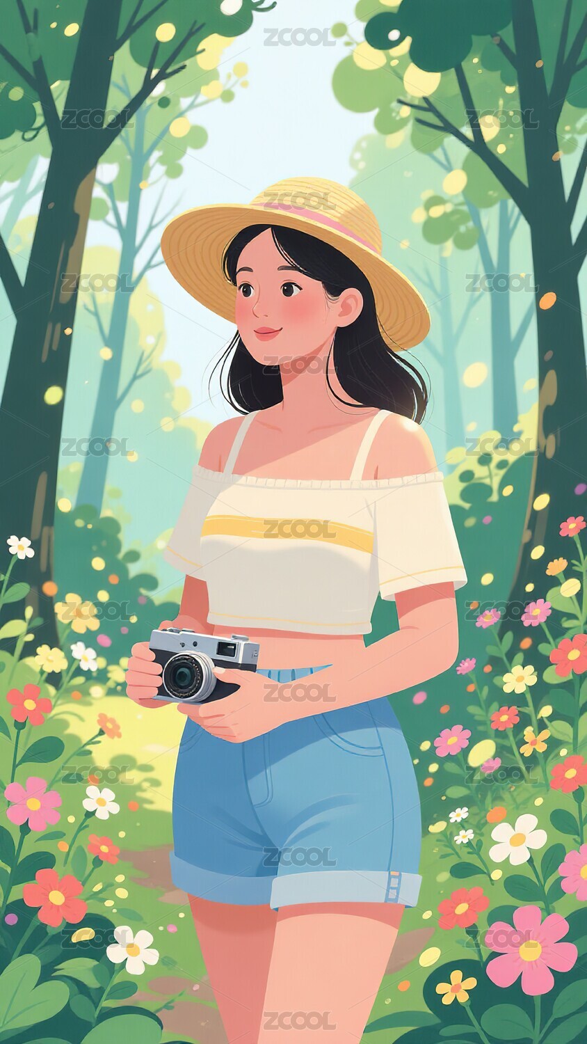 年轻,女性,手持,相机,背包,白衬衫,休闲,户外,摄影,旅行
