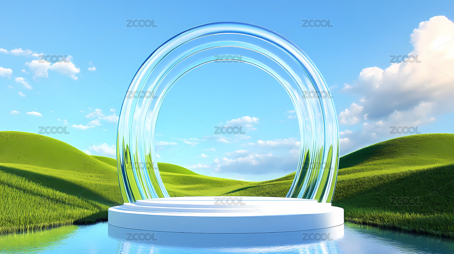 透明圆环与绿色草地的梦幻场景