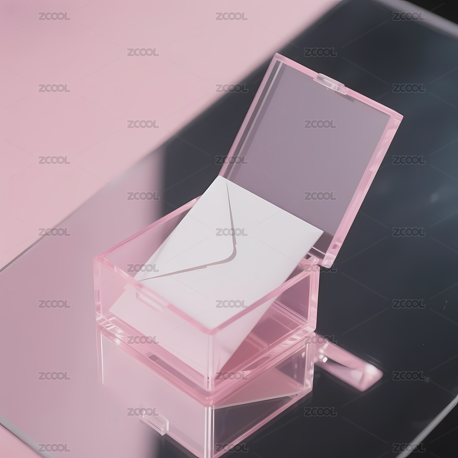 透明盒子,白色信封,静物摄影,简洁设计,现代风格,极简主义,室内拍摄,光影效果,粉色背景,几何形状