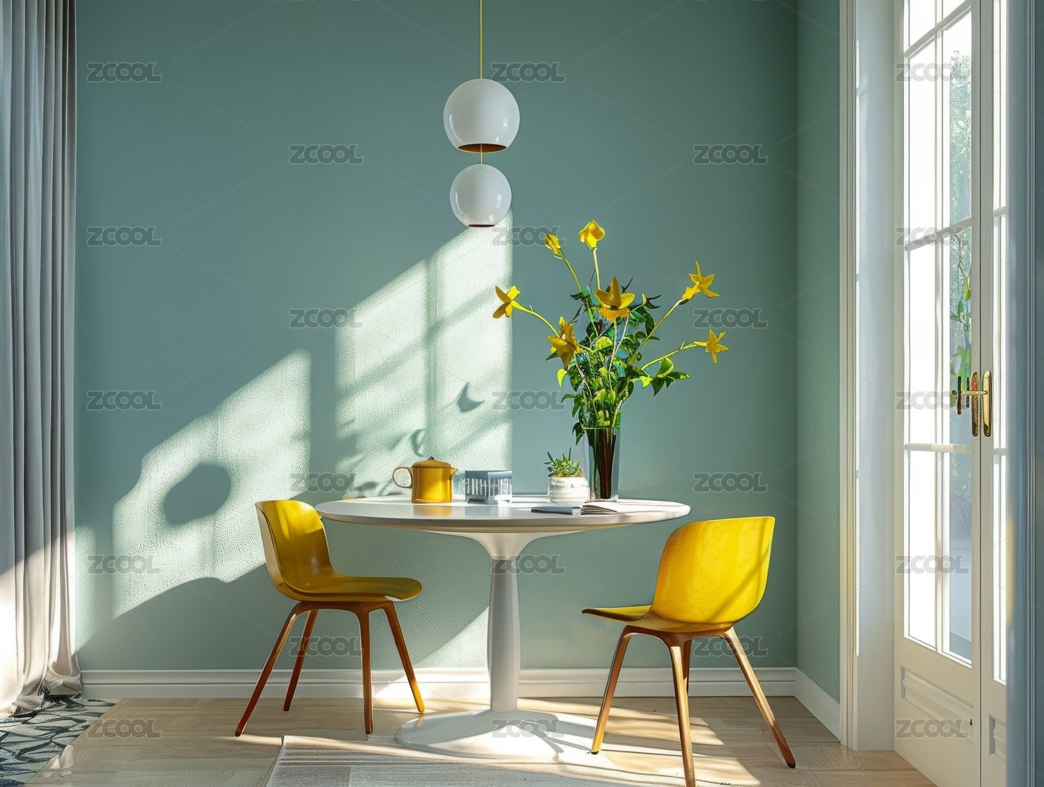 室内,北欧,优雅,墙面,蓝绿,家具,木质,金属,框架,吊灯