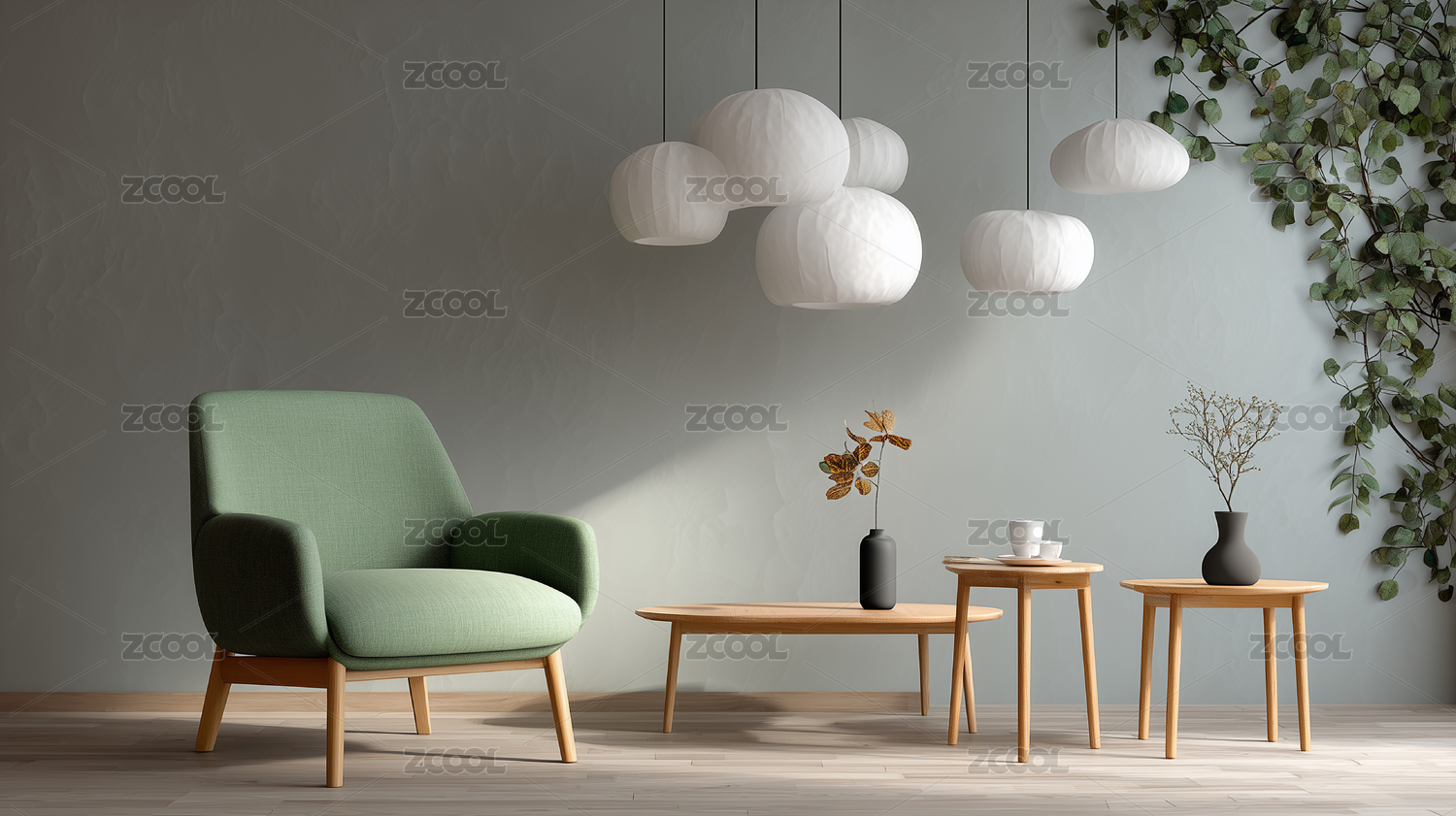 现代米绿墙三吊灯客厅