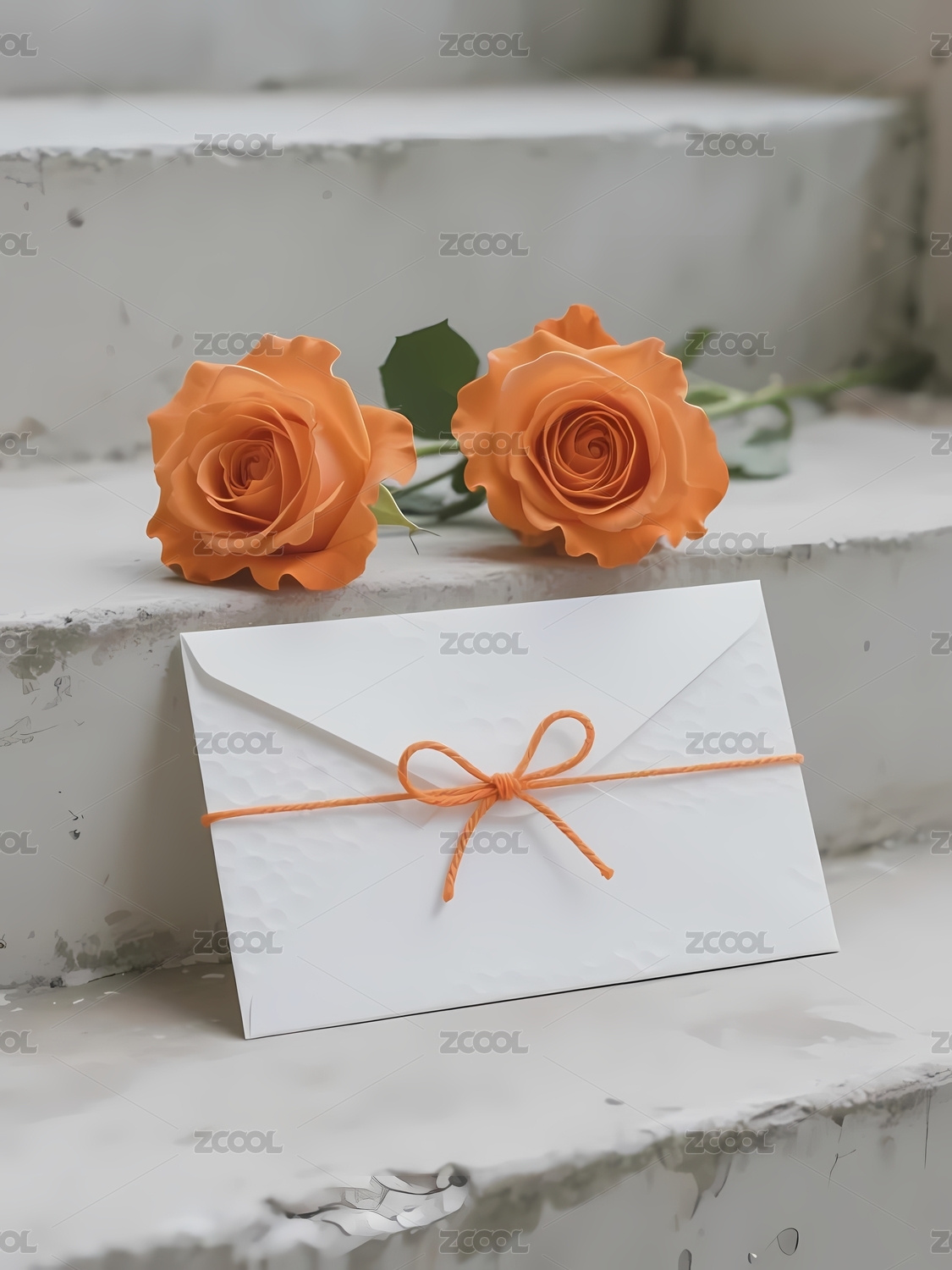花朵,信件,白色信封,自然元素,浪漫氛围,柔和光线,蝴蝶结,艺术摄影,简洁设计,装饰品
