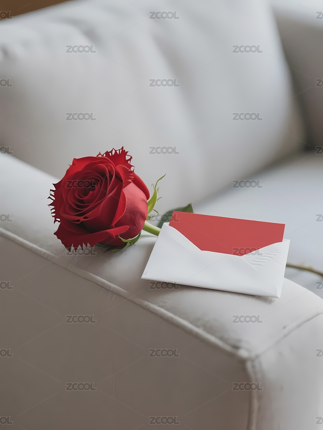 白色沙发上的一朵红玫瑰与信封