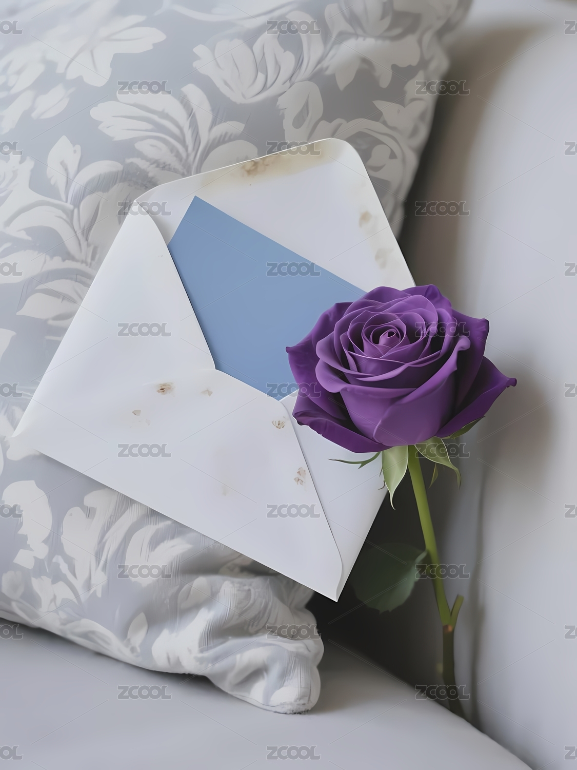 紫色玫瑰与信封置于沙发之上