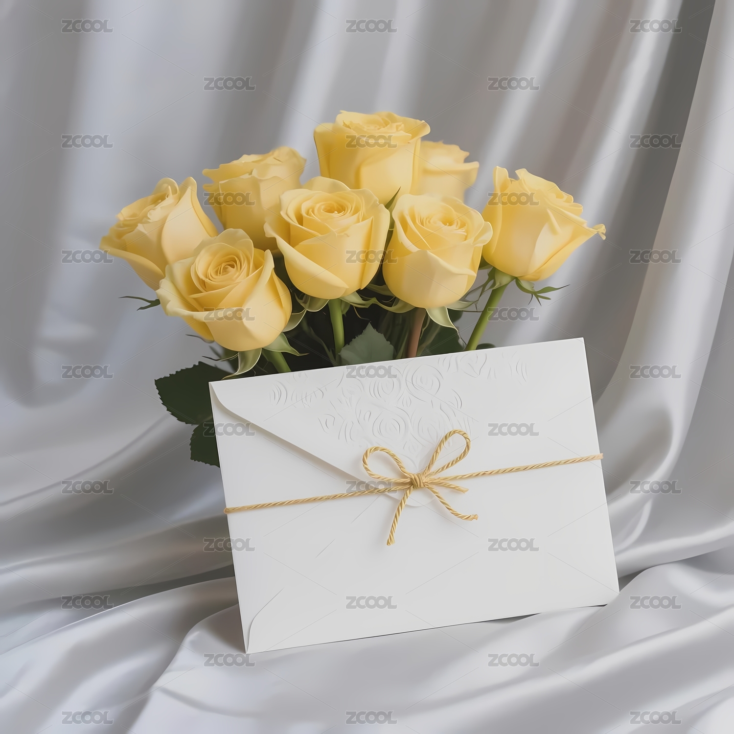 白色信封,浪漫氛围,精致装饰,温馨场景,黄色玫瑰,丝带蝴蝶结,柔和光线,丝绸布料,简洁设计,花卉元素