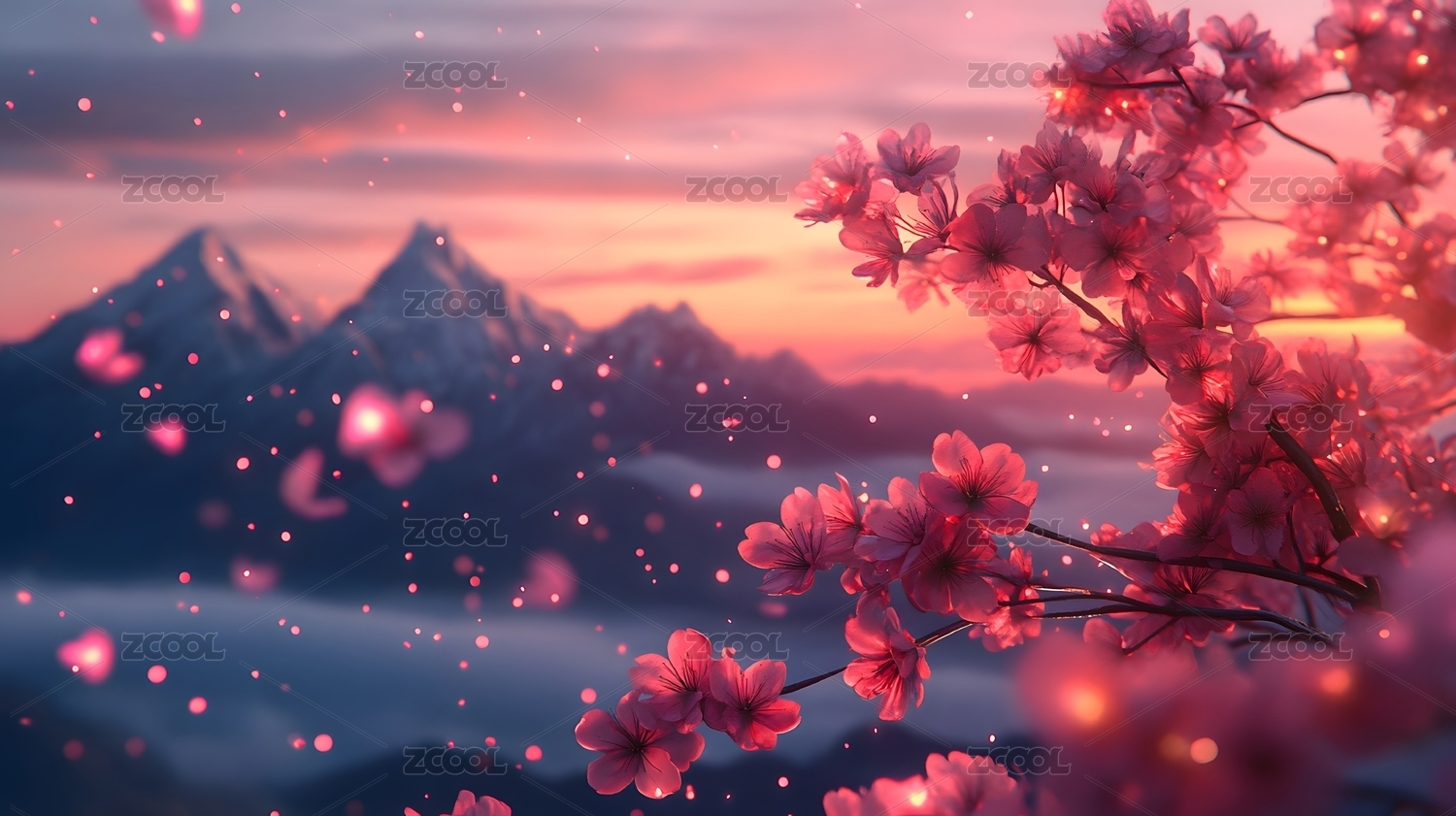 雪山樱花绽放的梦幻春景