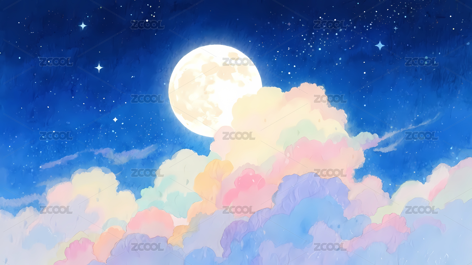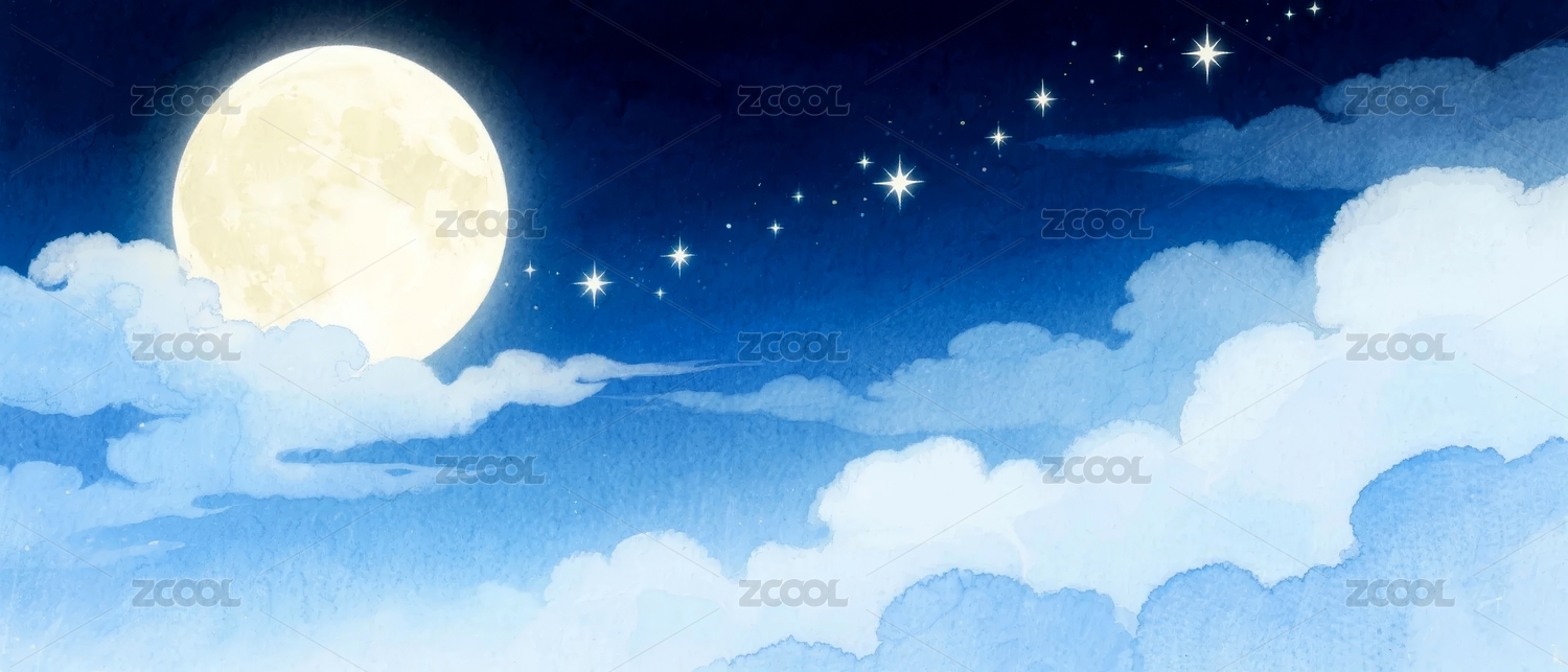 月亮,云朵,夜空,插画,景色,梦幻,蓝色,唯美,自然,元素