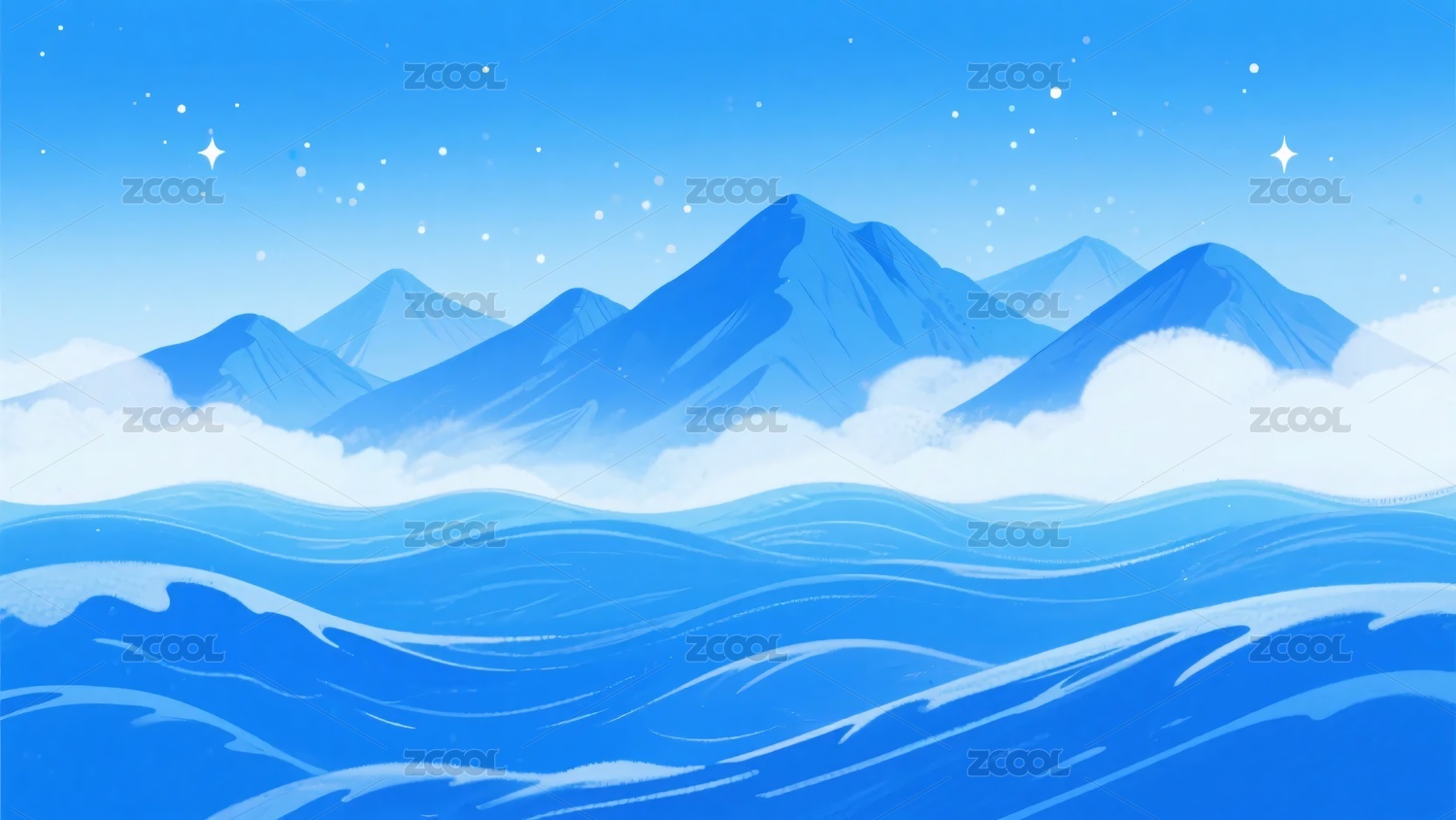 梦幻蓝色星空海浪插画