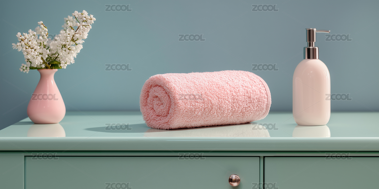 蓝色背景前挂着条纹毛巾,旁边还一瓶洗手液