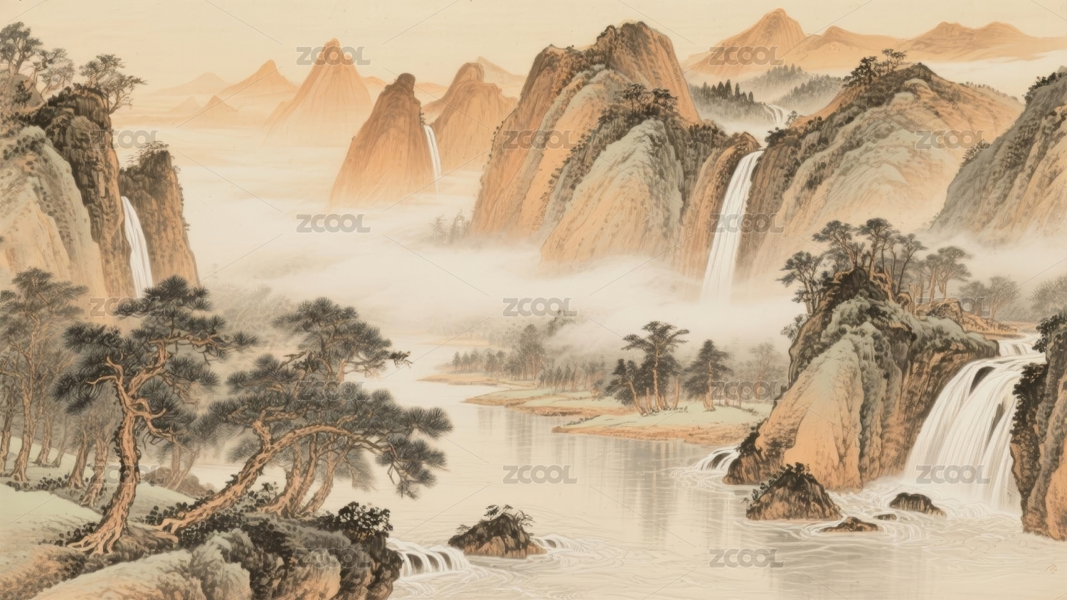 山水画中层峦叠嶂瀑布飞流的壮丽景色