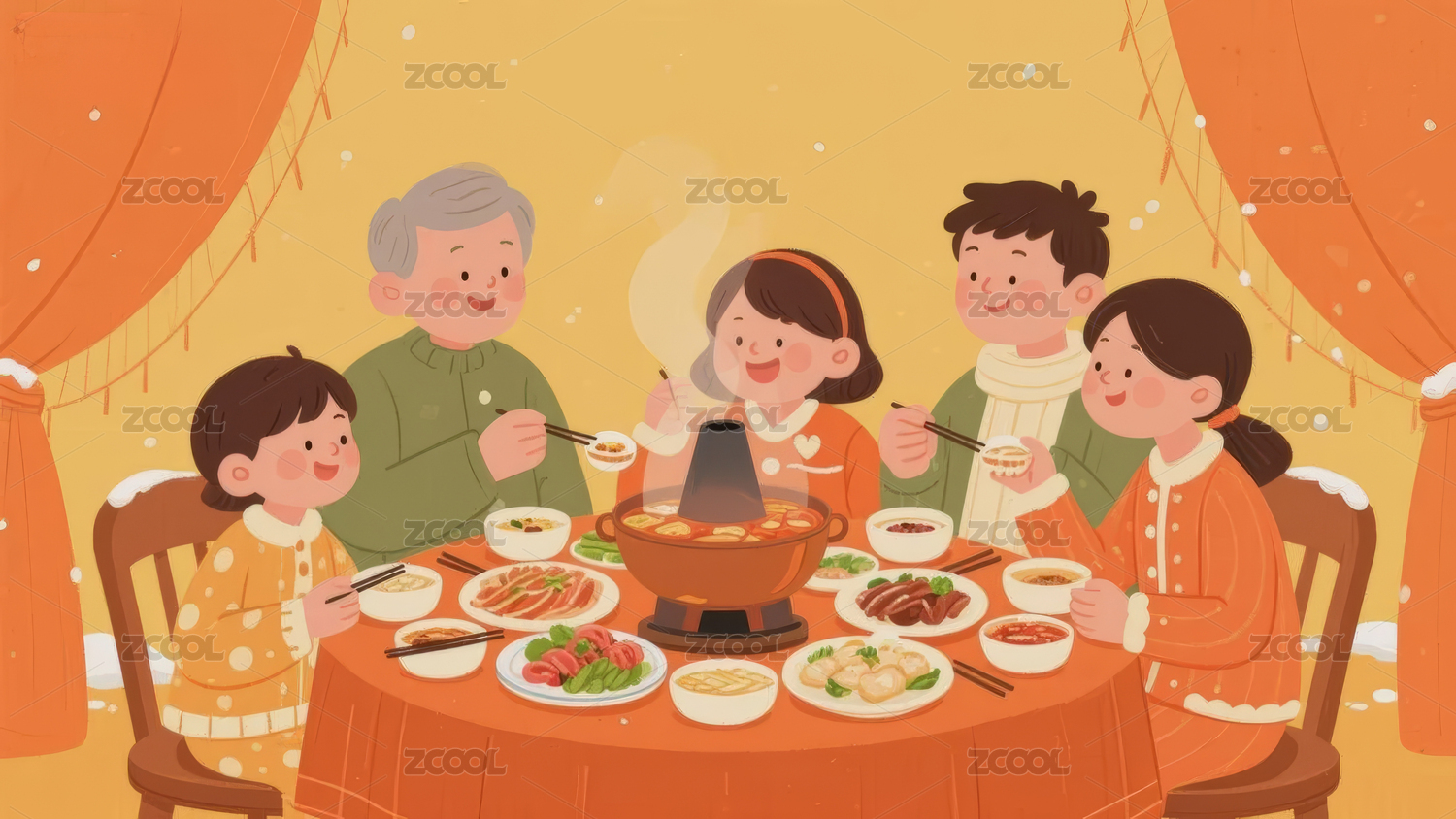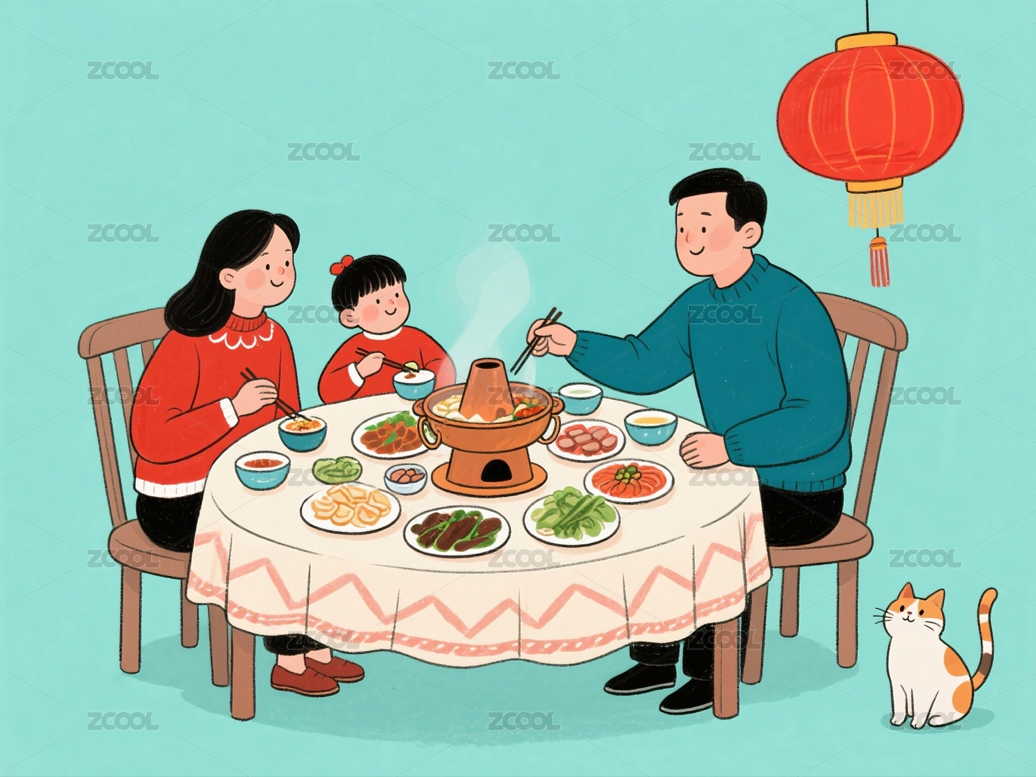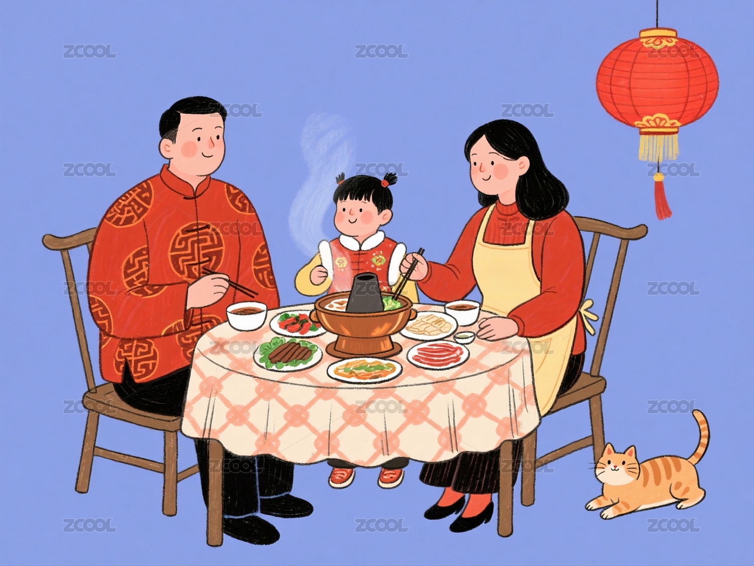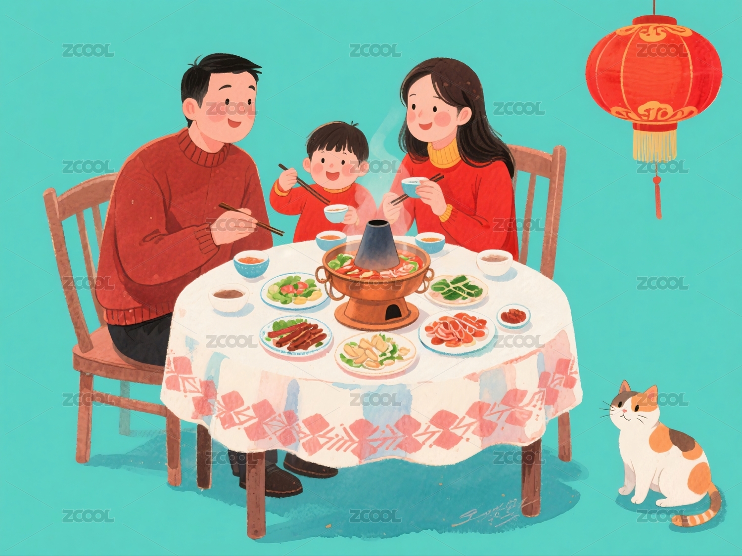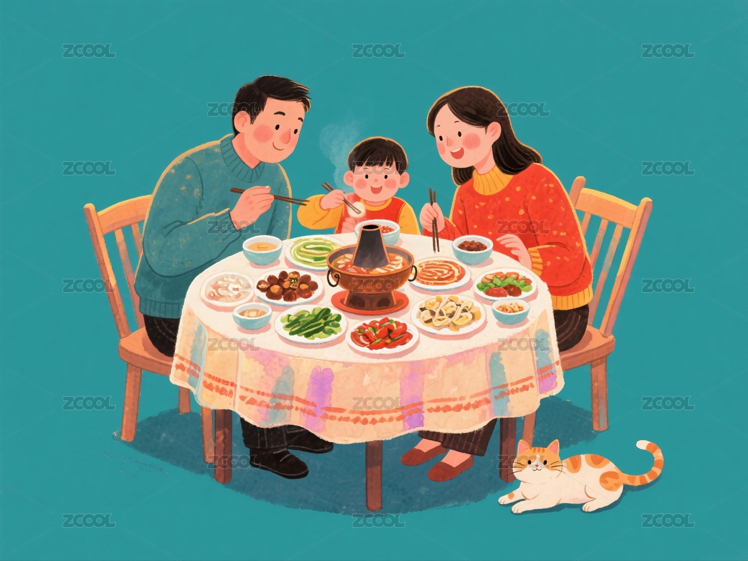 人物,红色,盘子,圆形,父母,餐桌,食物,椅子,围坐,桌面