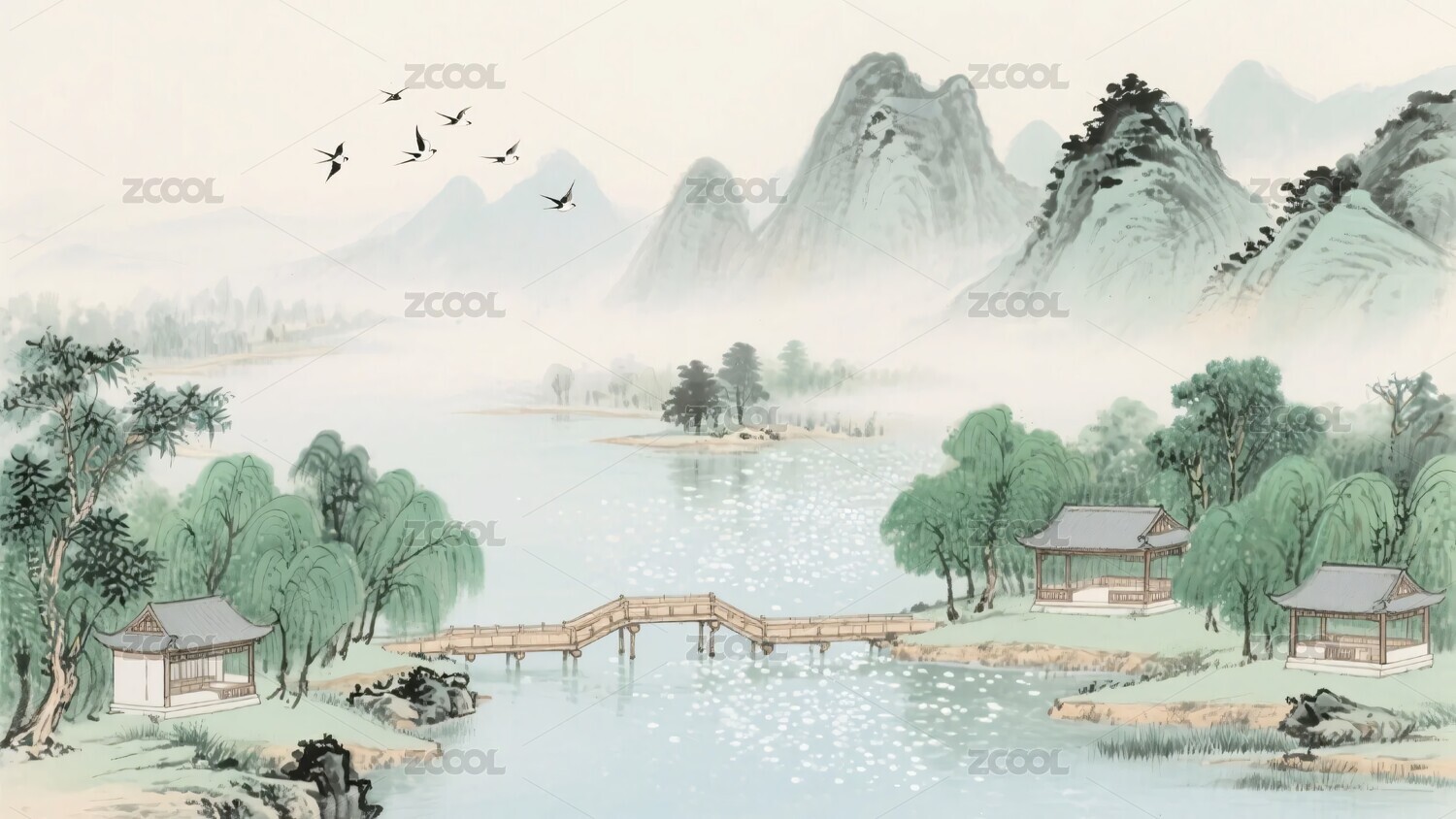 山水,湖泊,亭子,树木,插画,风景,水墨,中国风,自然,景色