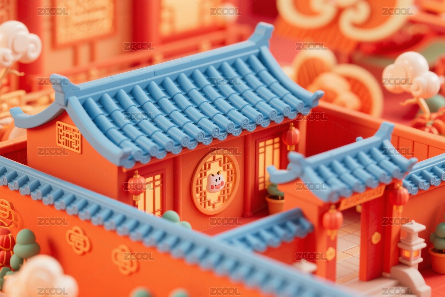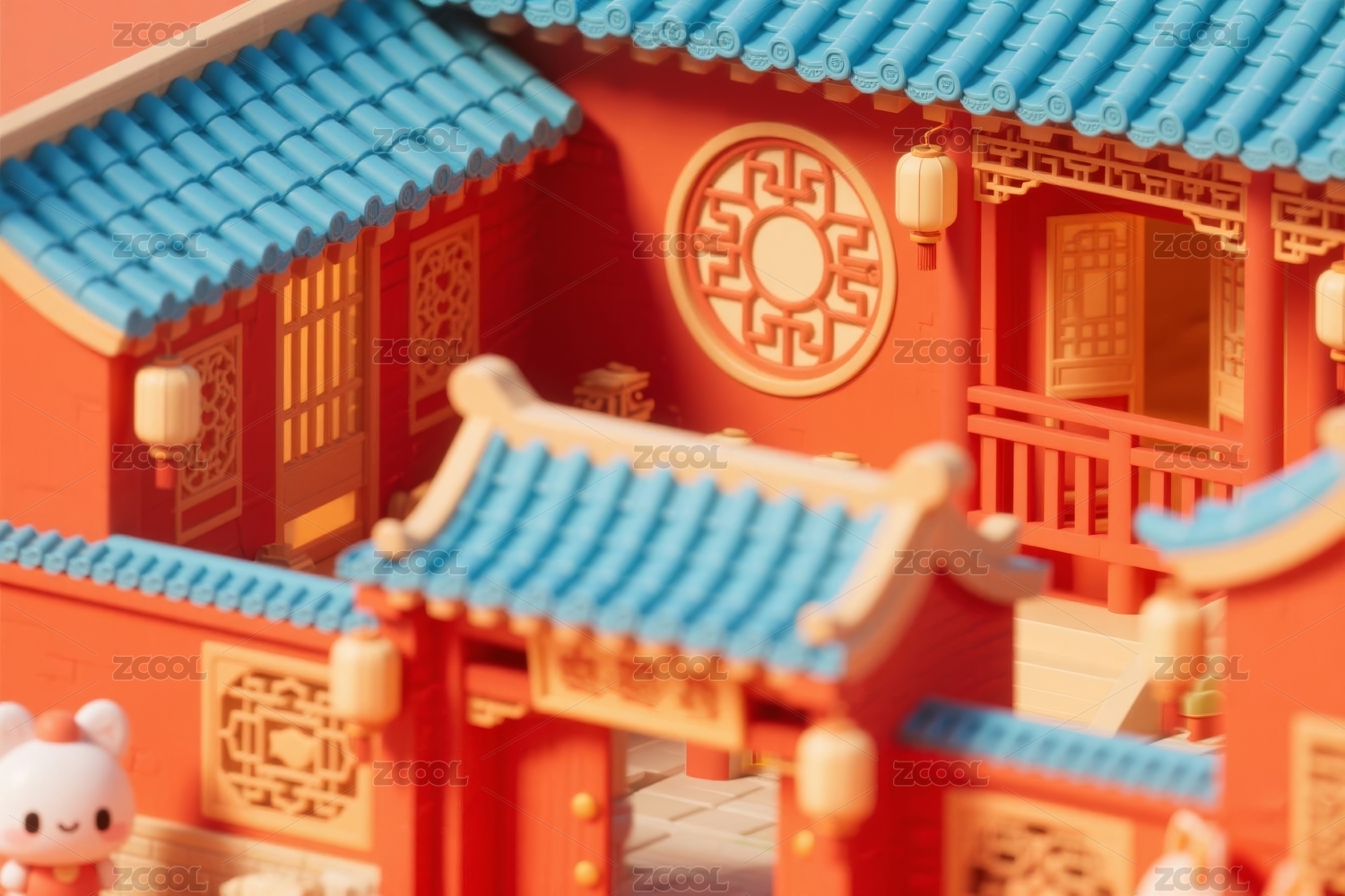 主视觉,中式,庭院,喜庆,展示,背景,传统,建筑,红灯笼,元素