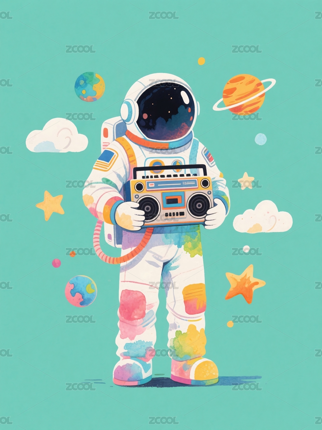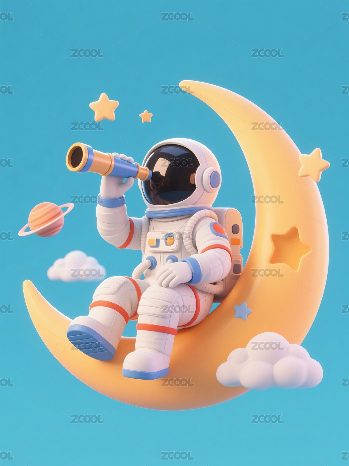 宇航员漂浮在梦幻星空3D卡通插画海报
