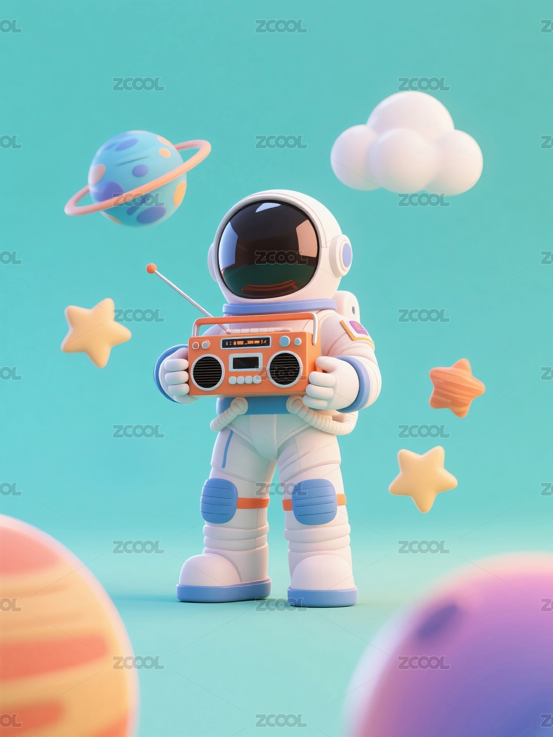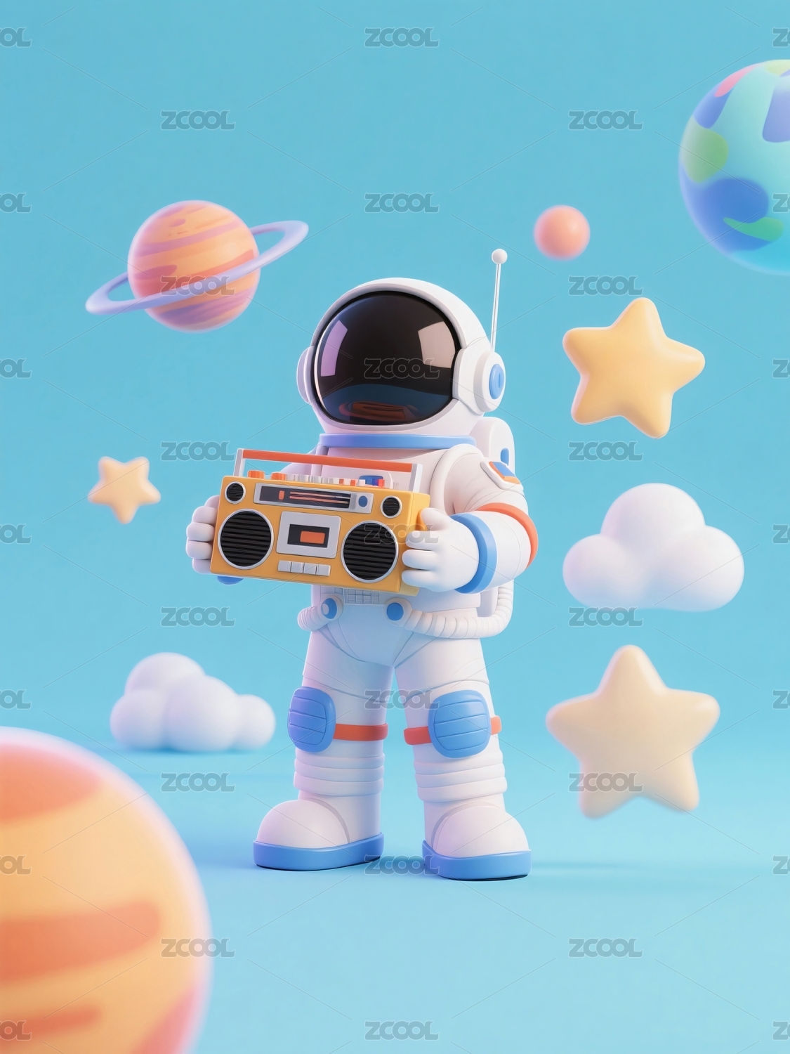 宇航员拿着收音机播放音乐
