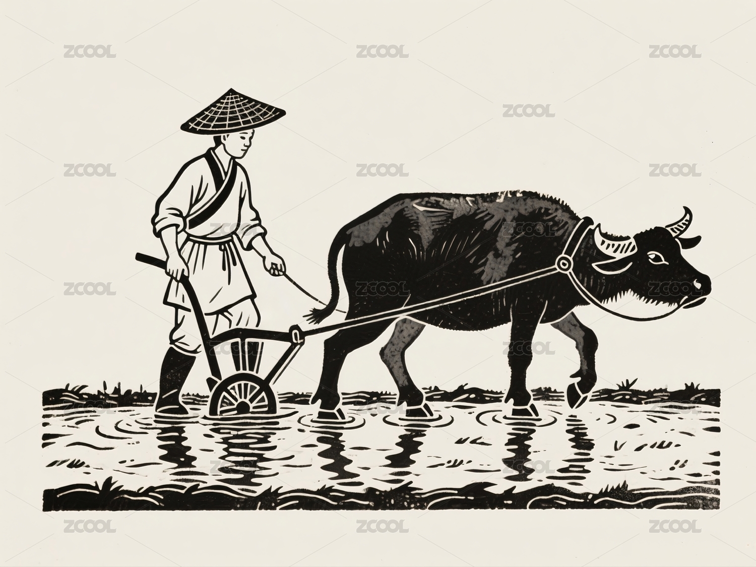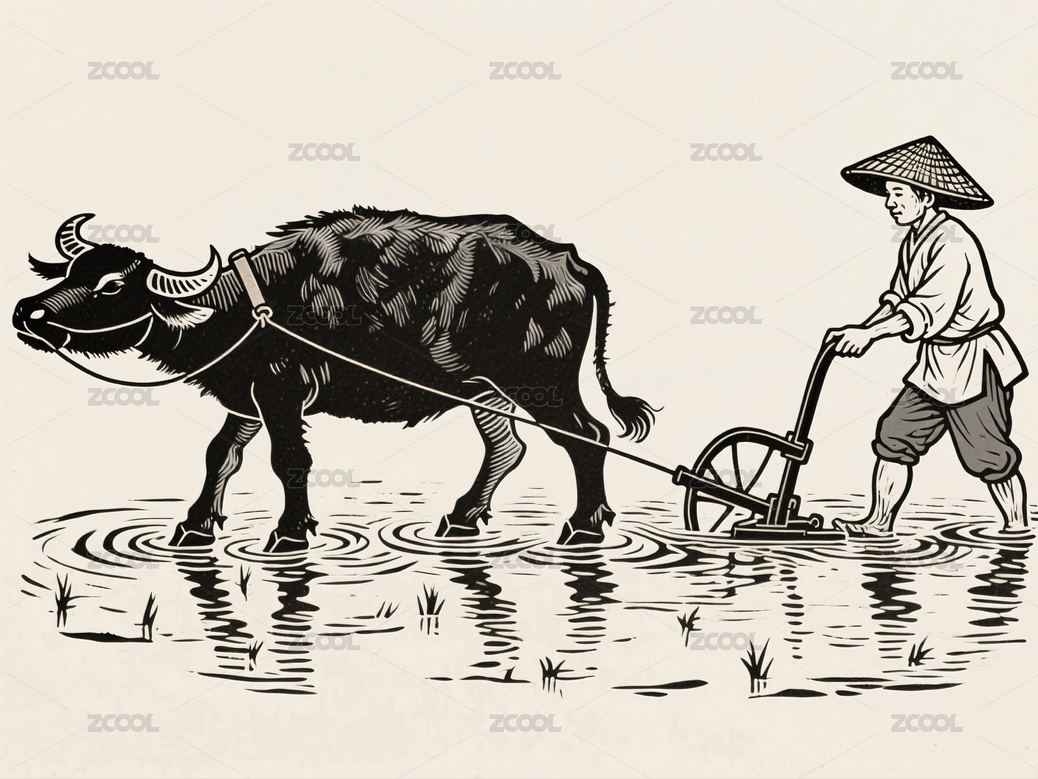 农夫耕田水牛劳作场景