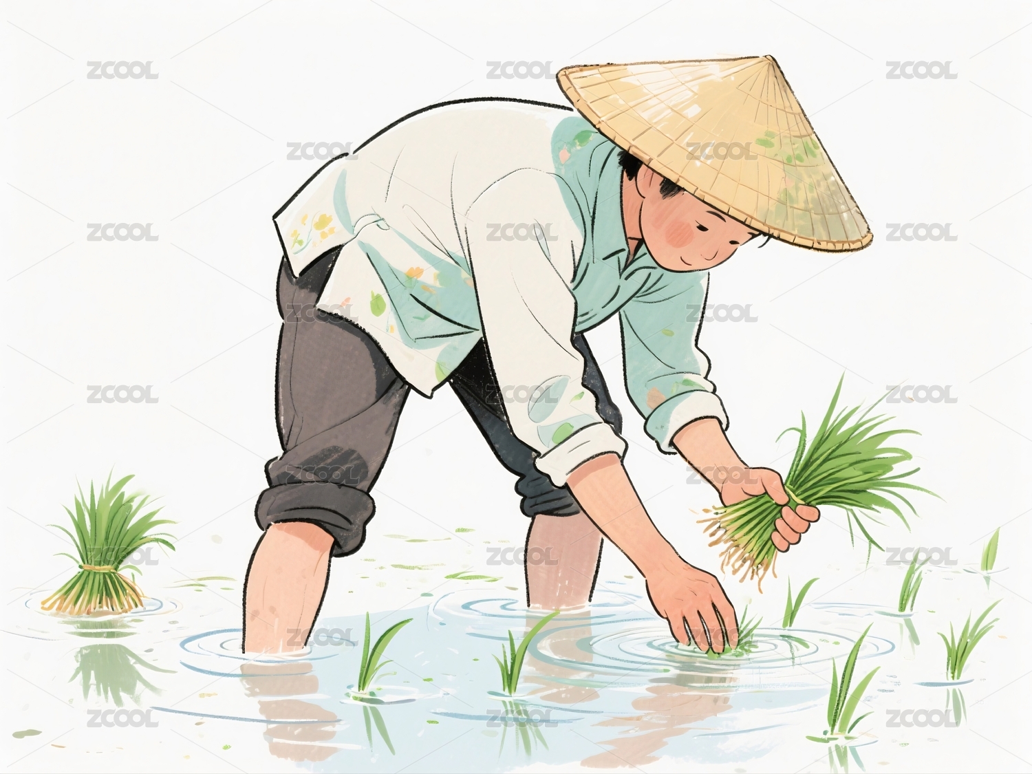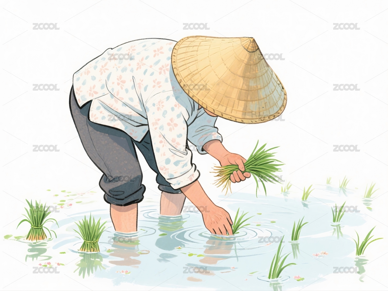 农夫戴斗笠弯腰插秧劳作
