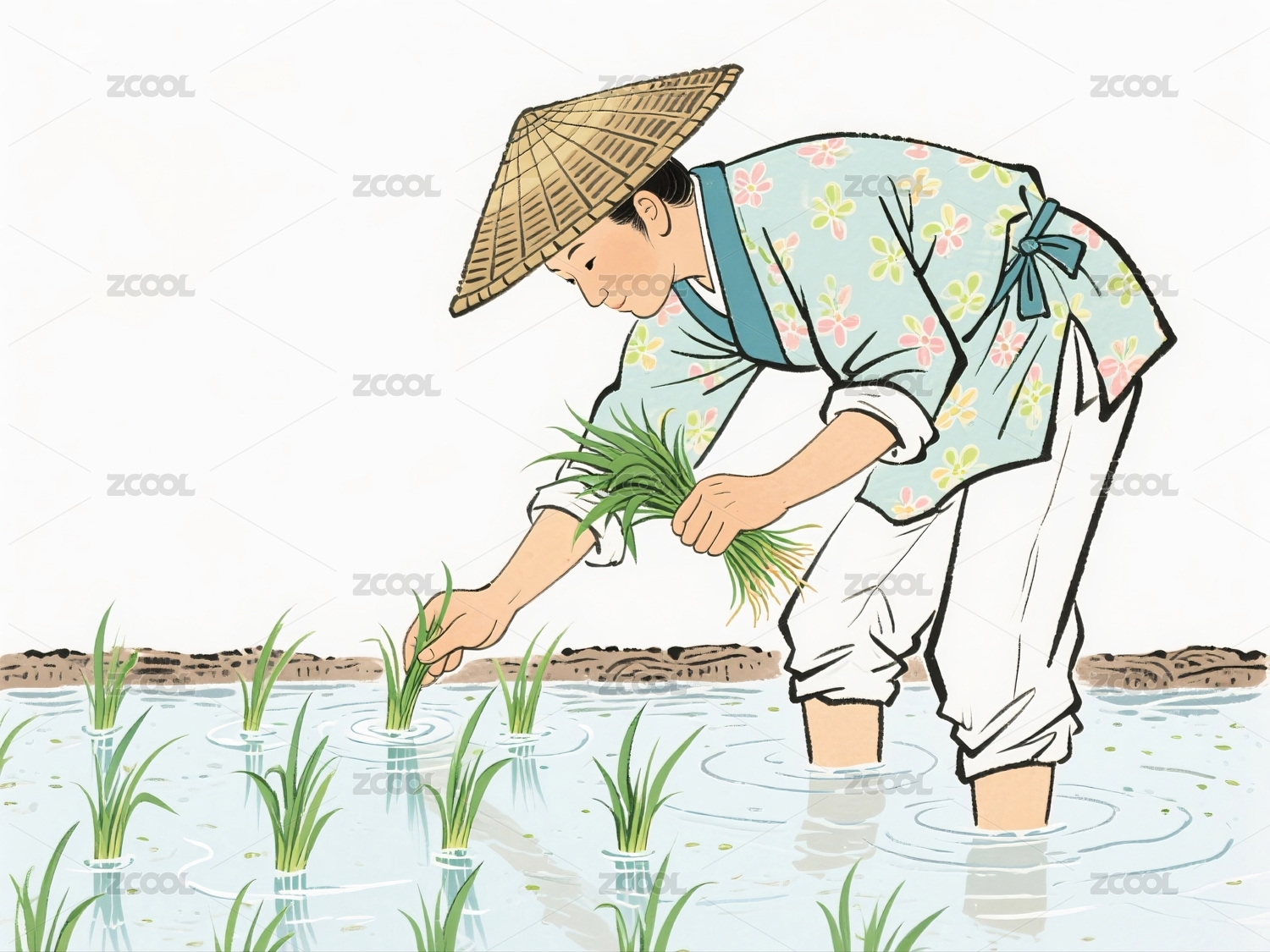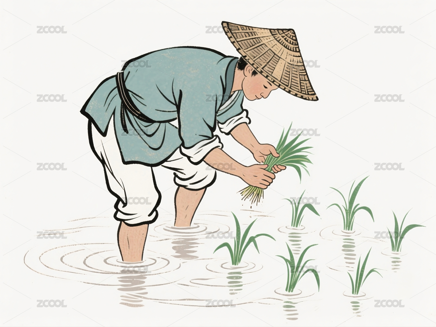 农夫水田插秧劳作场景
