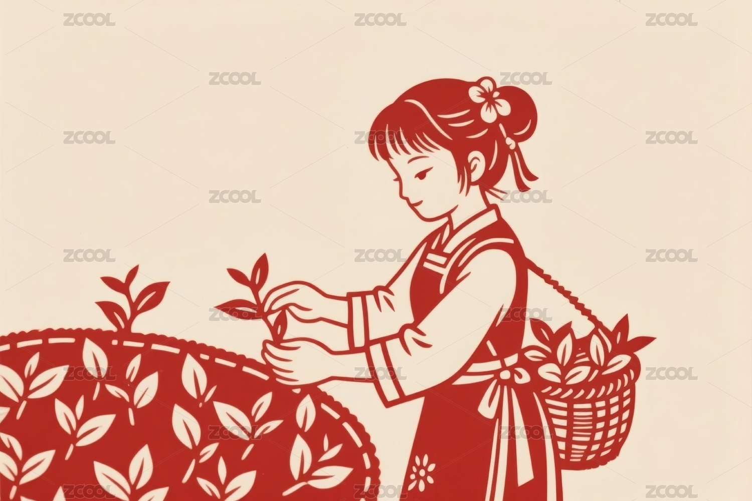 茶农采茶草帽衣衫茶树竹篓