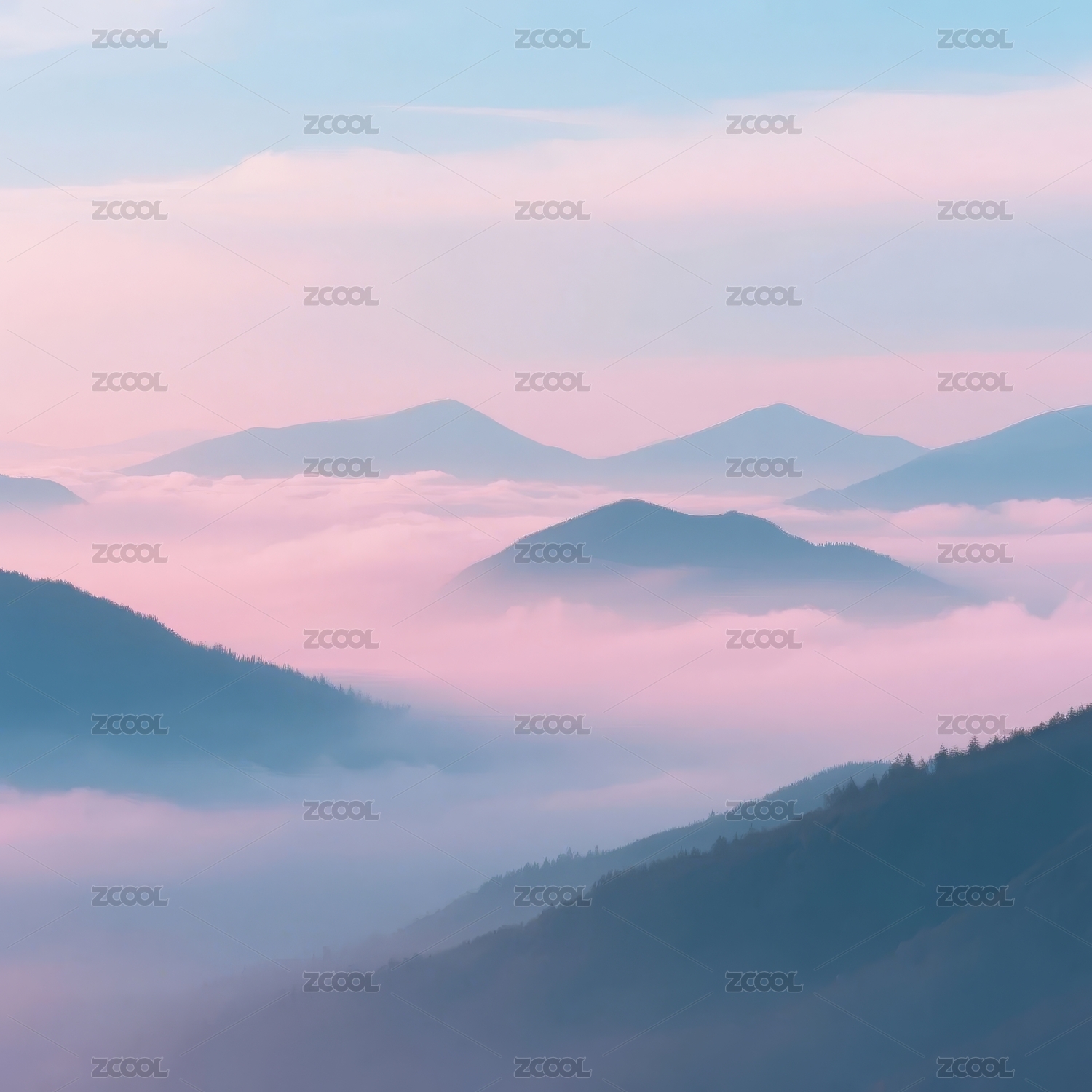 山间薄雾映粉蓝天空