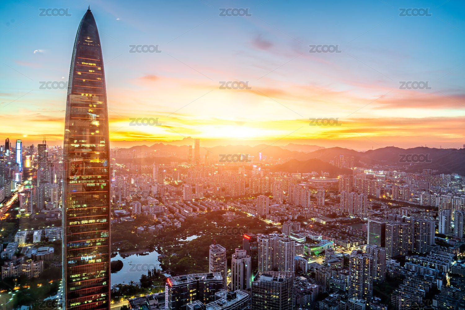 中国深圳市福田区城市天际线建筑群高楼大厦晚霞风光,平安金融中心