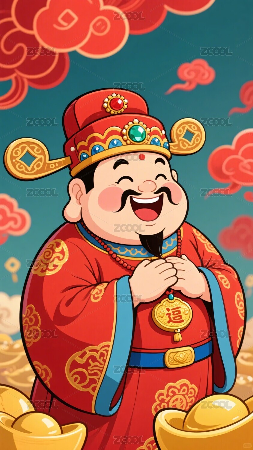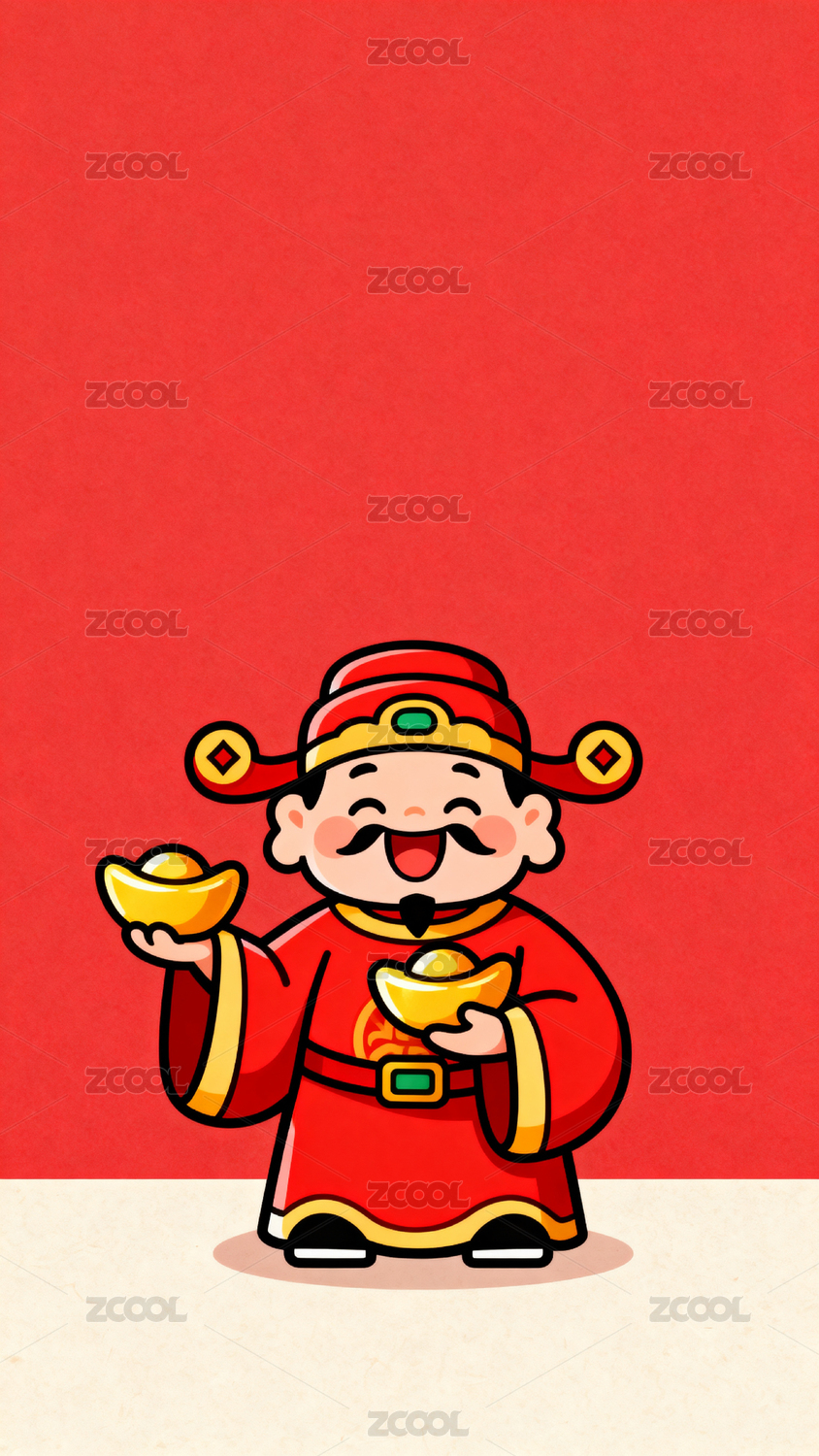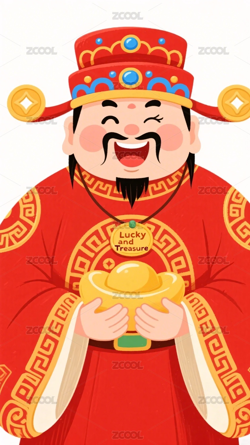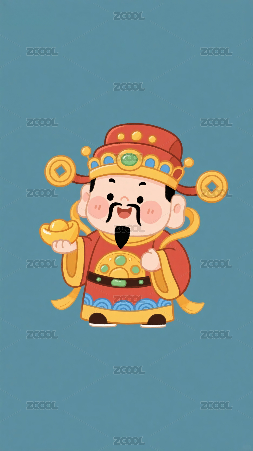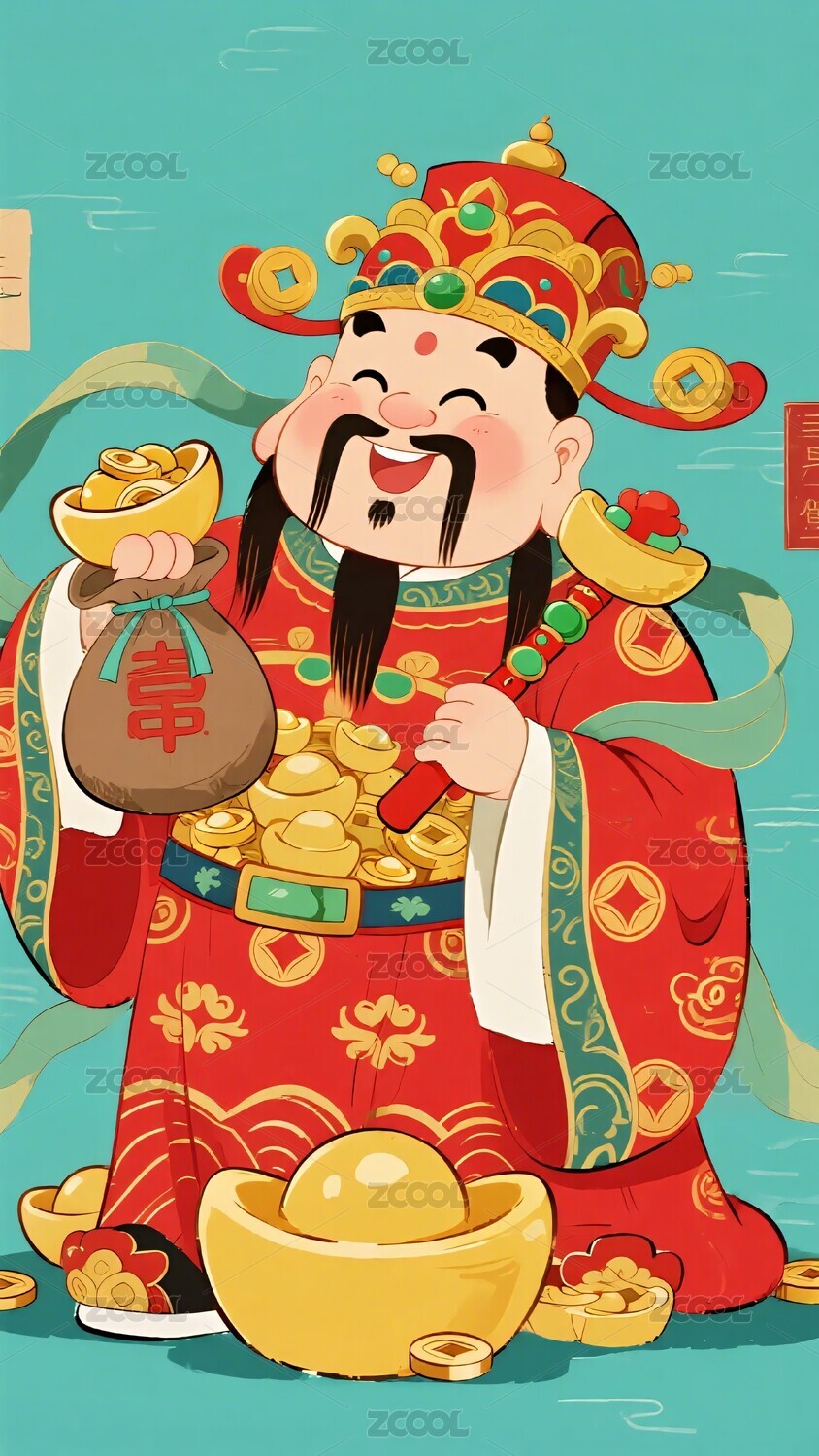 财神,插画,卡通,喜庆,传统,节日,中国风,红色,服饰,金币