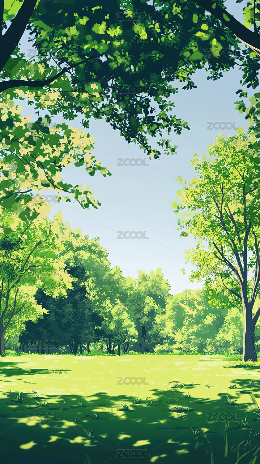 树林,阳光,蓝天,白云,插画,风景,自然,树木,主题词,模板