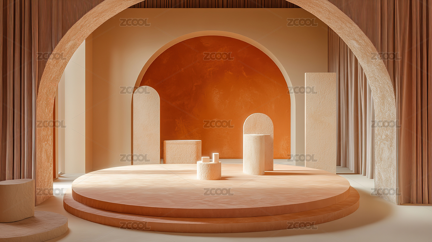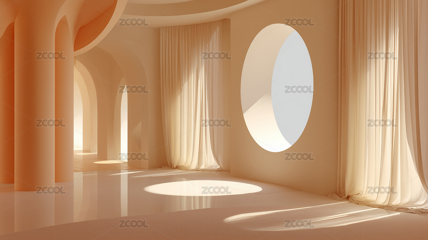 室内,桃色,圆窗,柱子,弧形,几何,窗帘,流动,光线,阴影