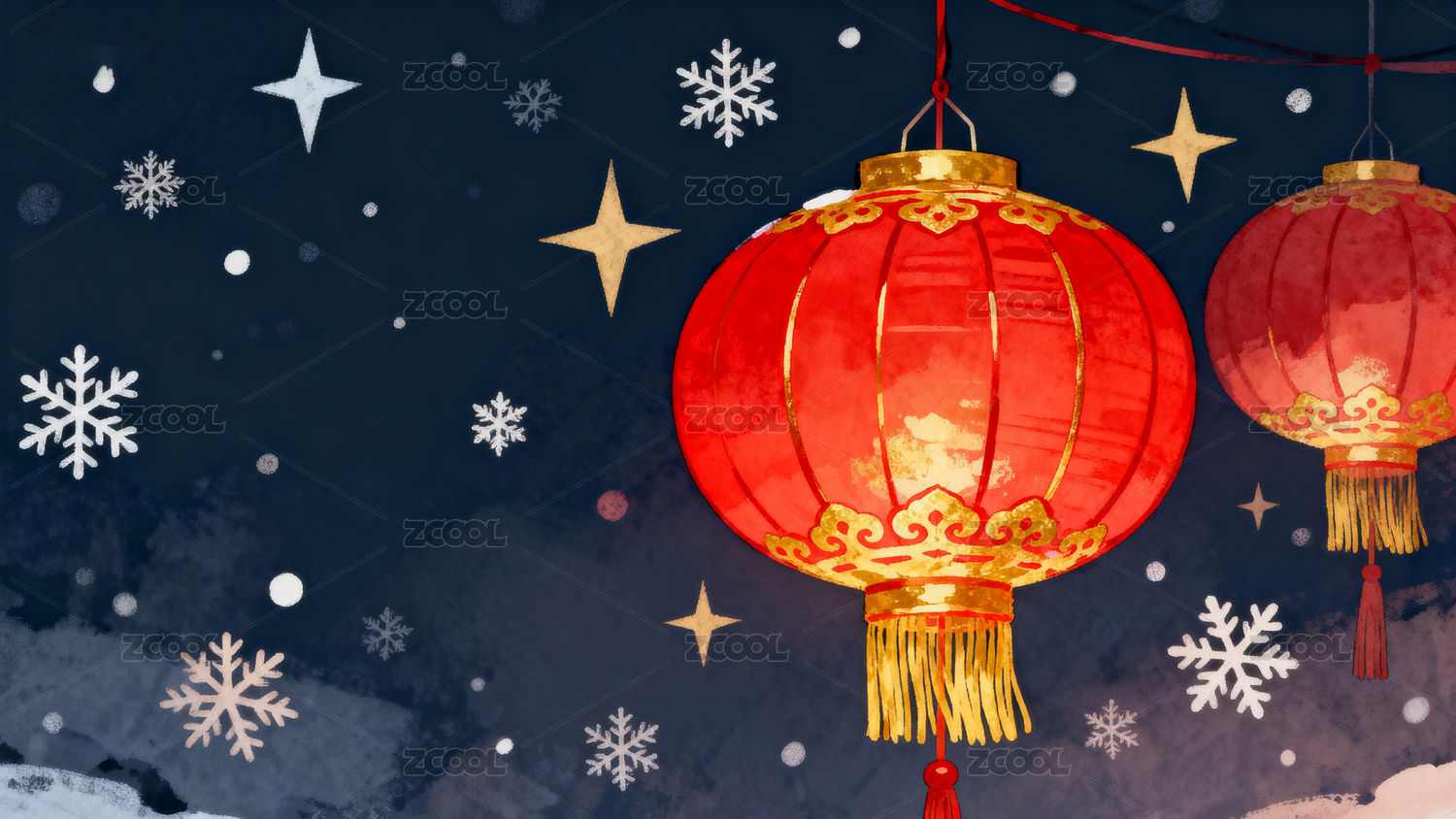 卡通大山下雪灯笼梅花大寒清新蓝色插画