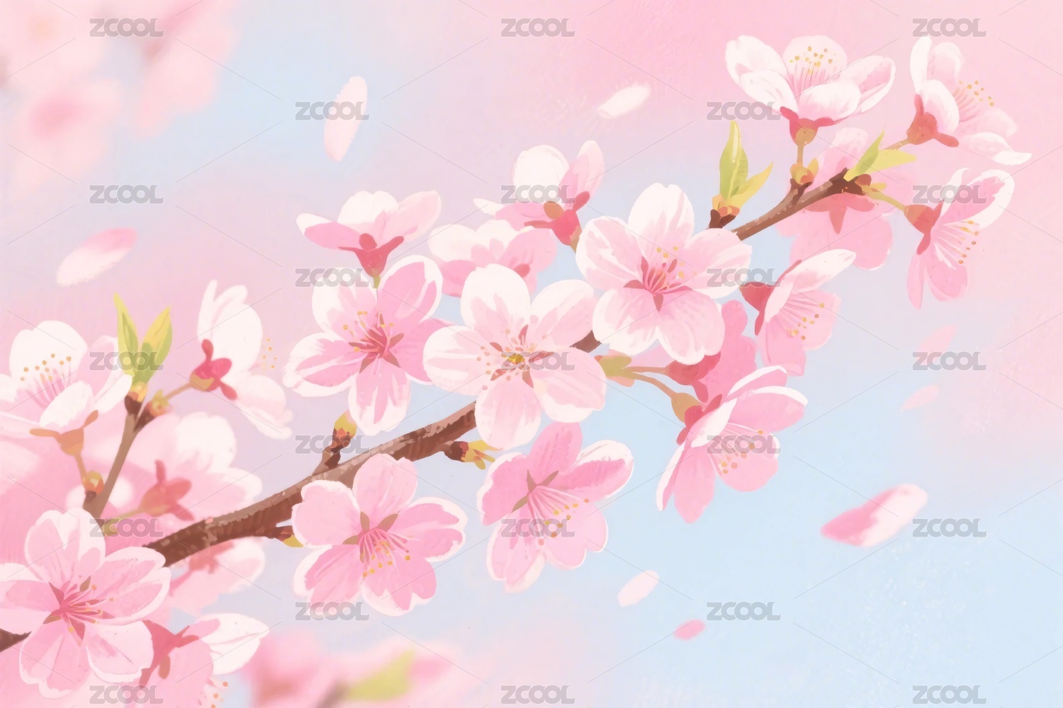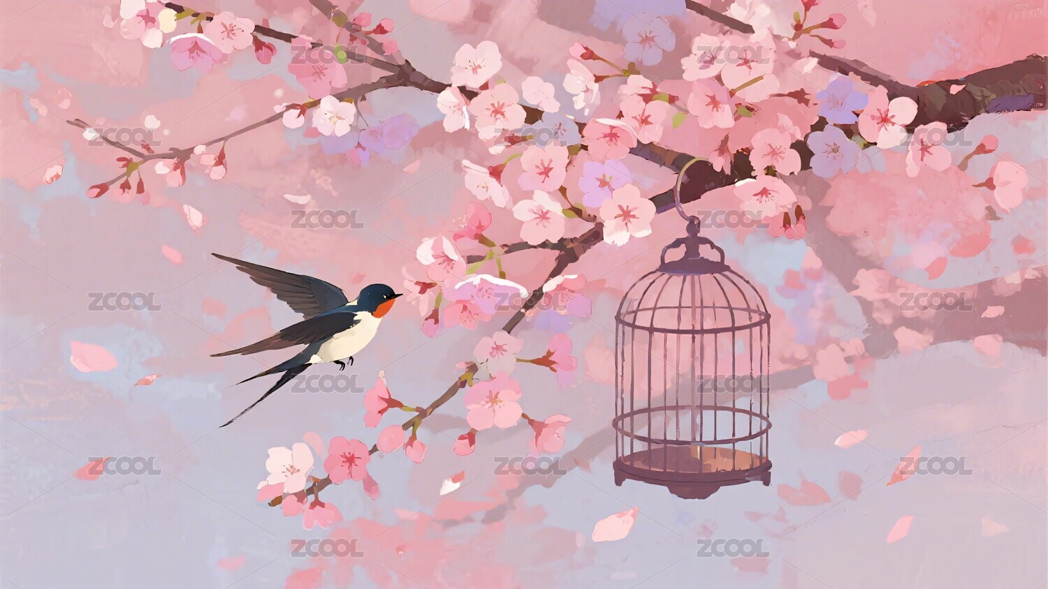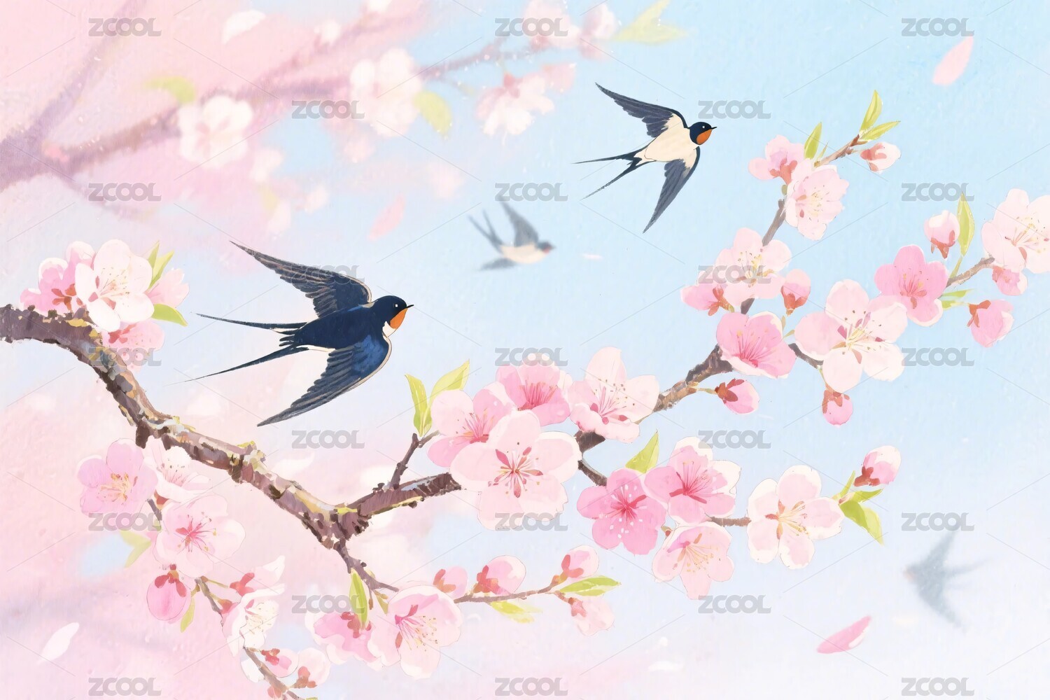樱花,飞燕,花朵,春日,自然,插画,唯美,清新,矢量,风景