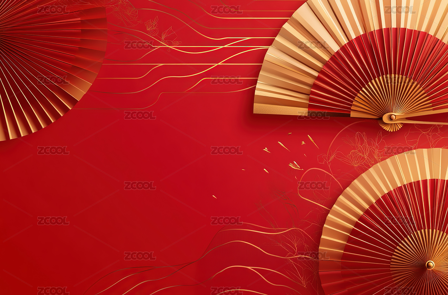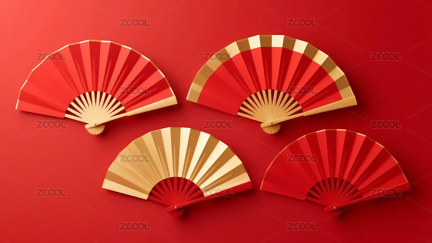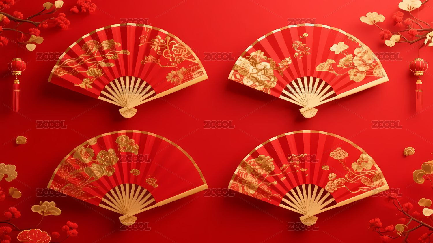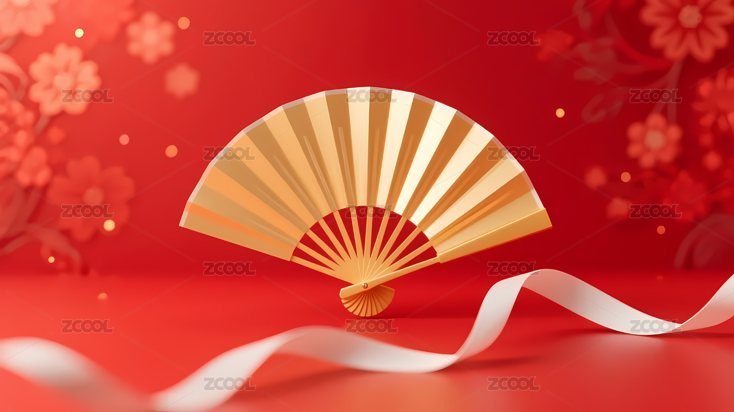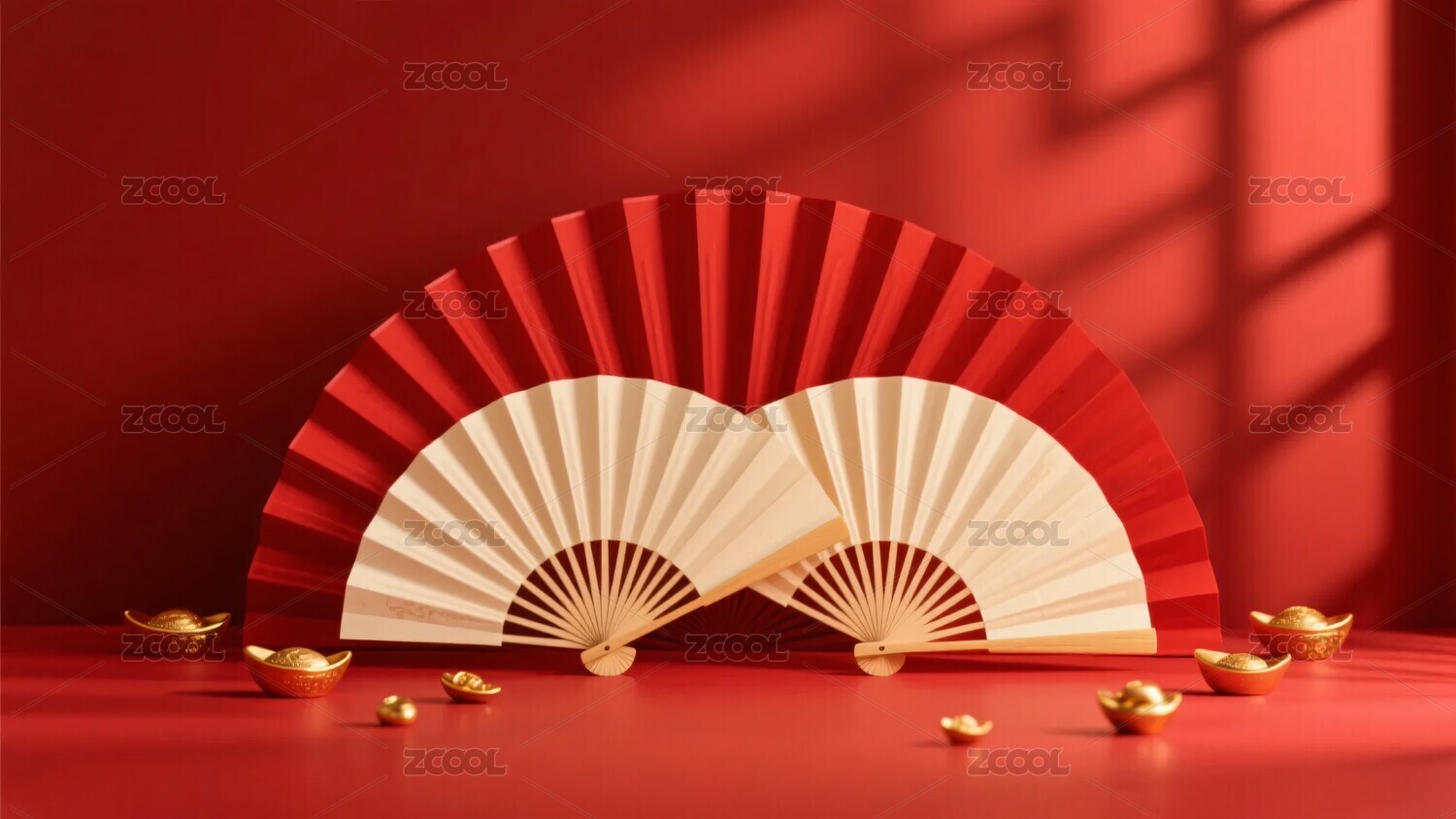 折扇,金元宝,红色背景,插画,装饰,中式,传统,元素,喜庆,画面元素