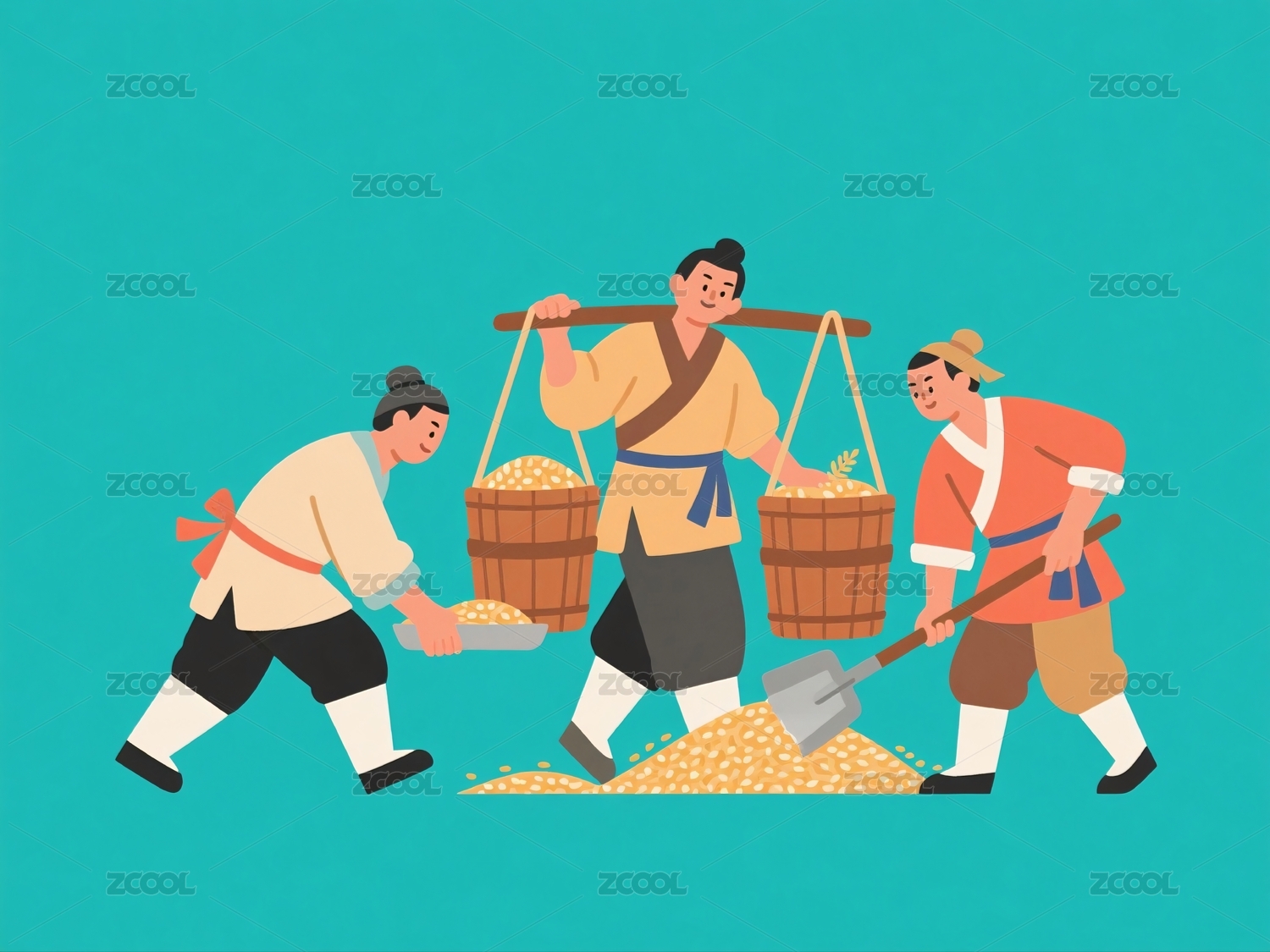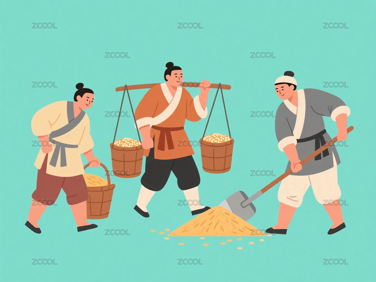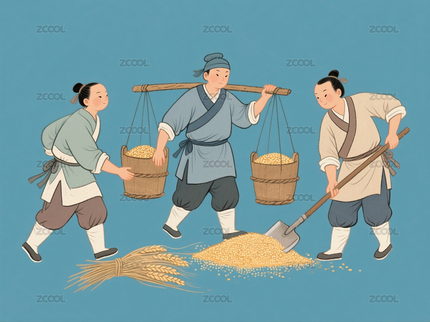农夫挑担运粮两人铲粮