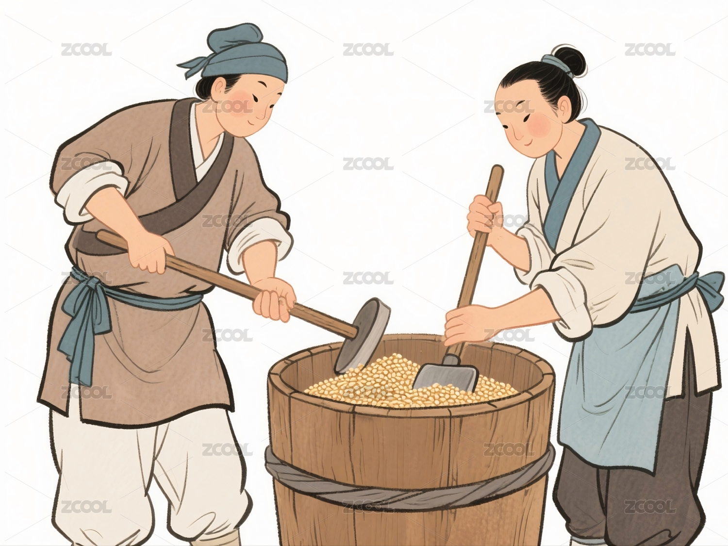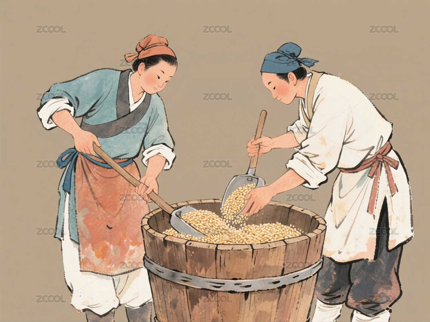 两人木桶内搅拌颗粒物