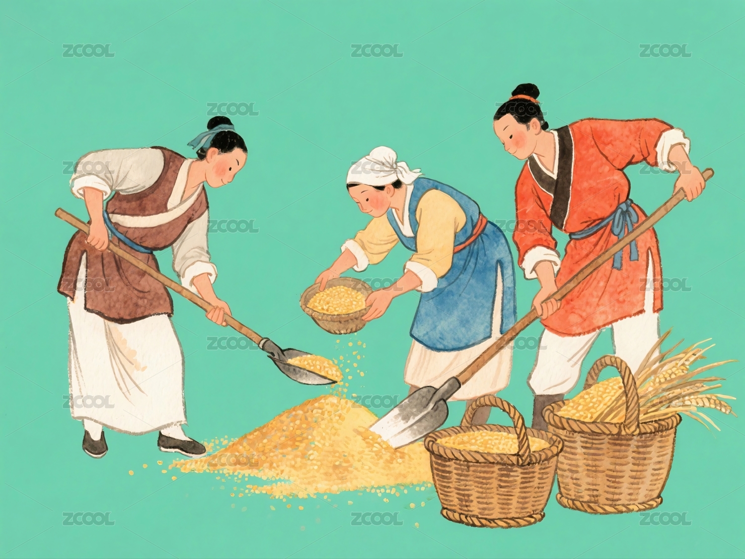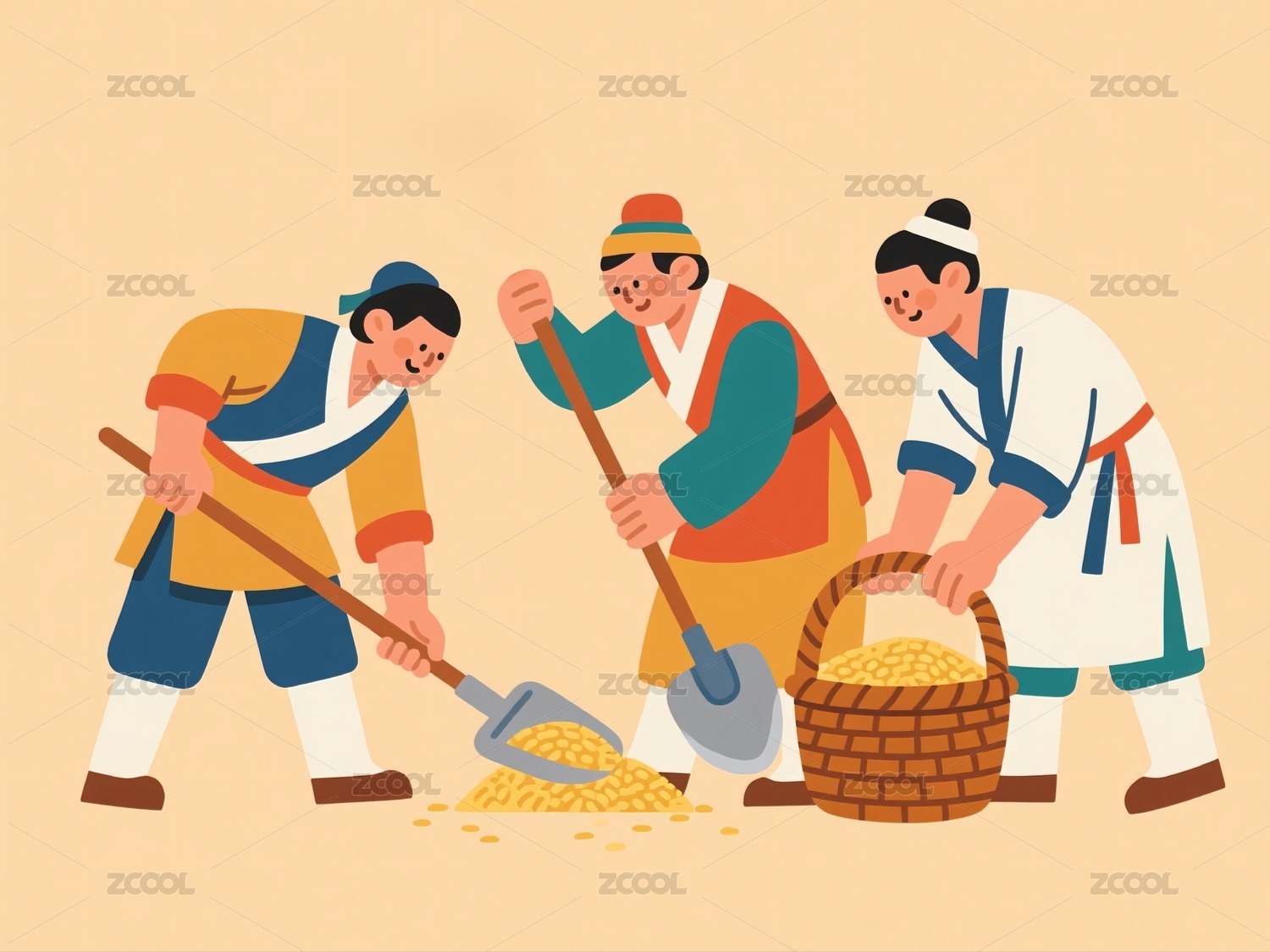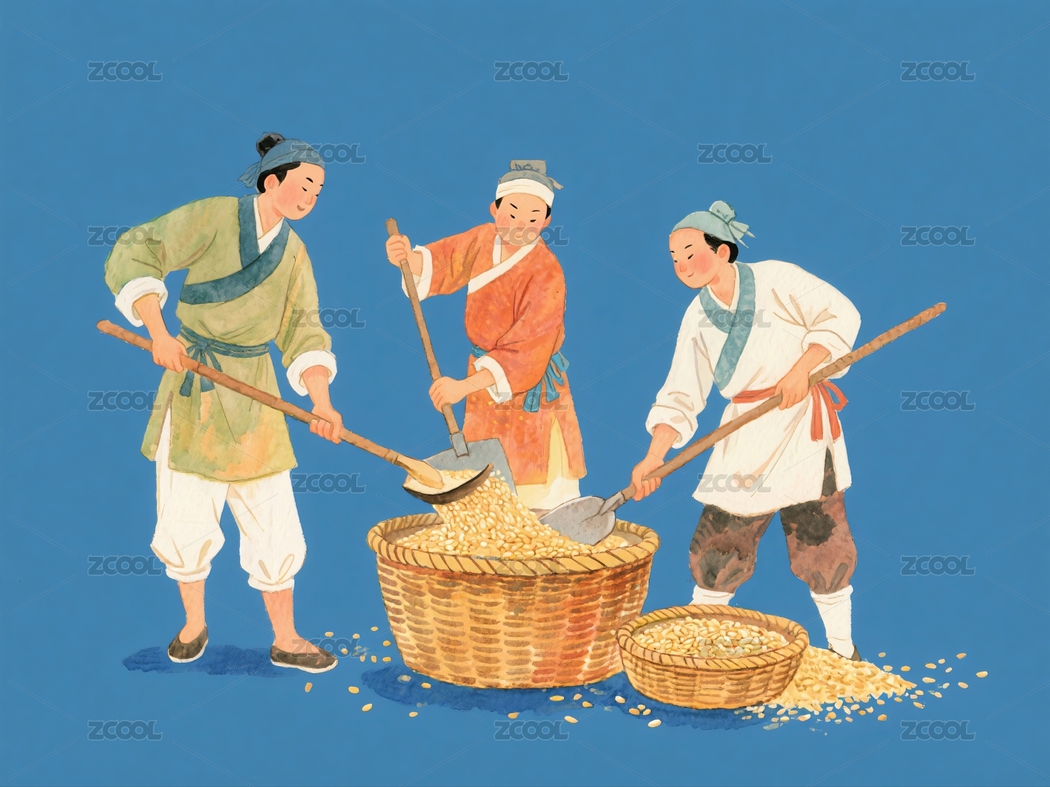 三人铲运谷物劳作场景