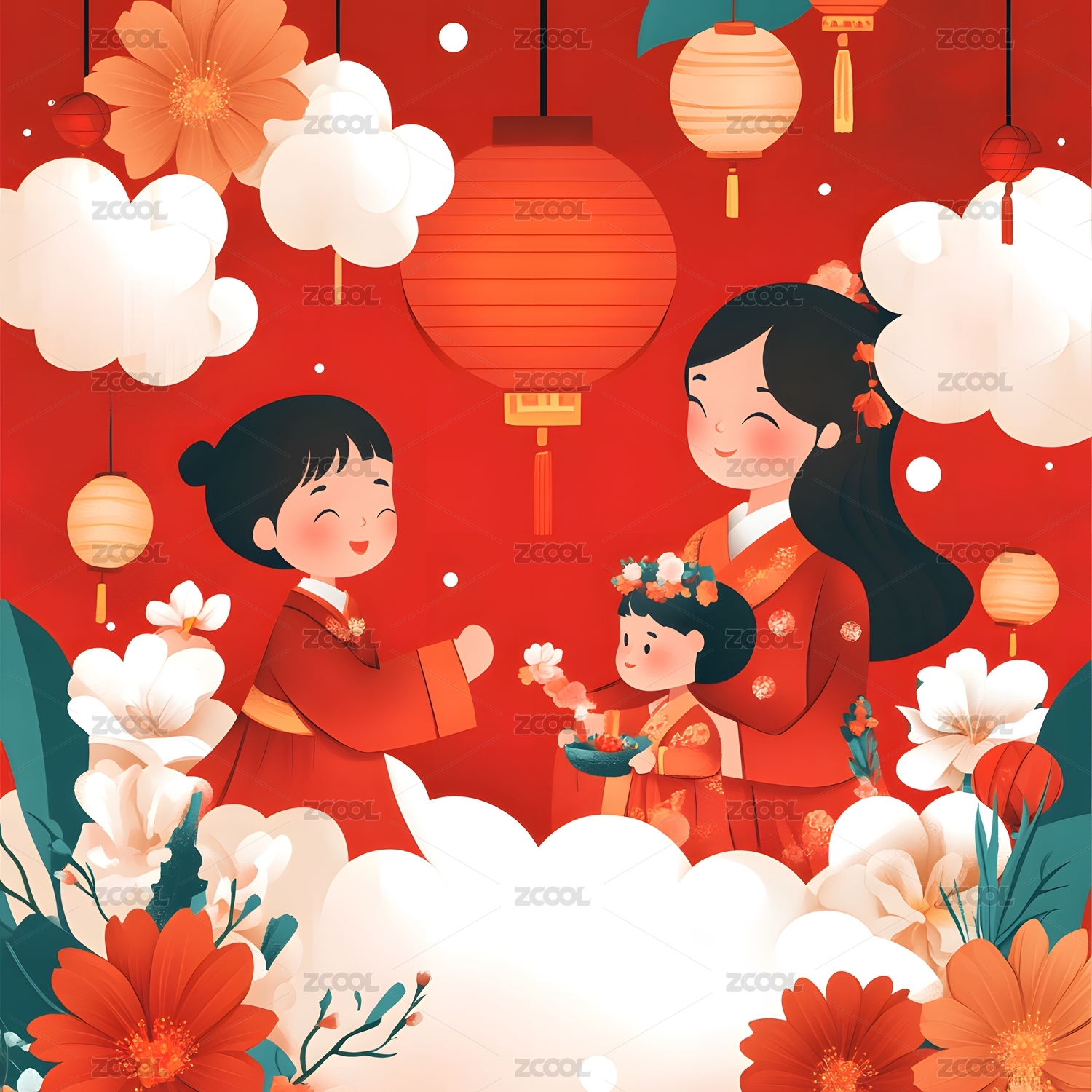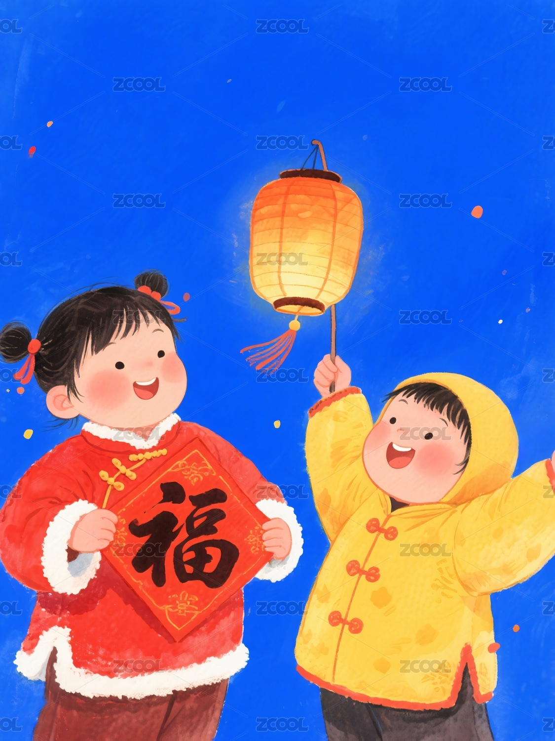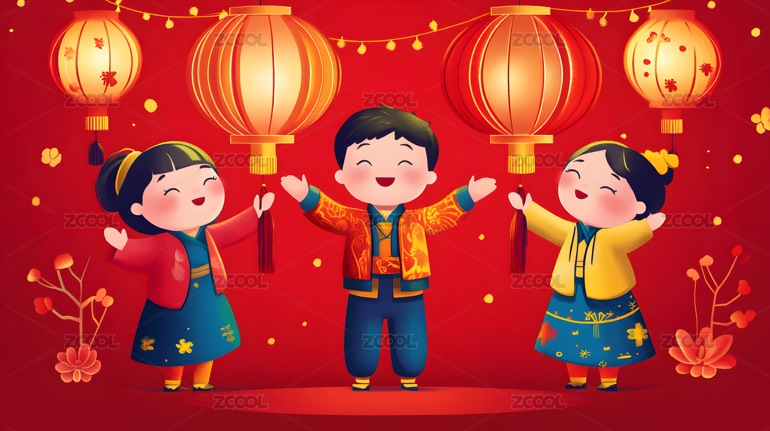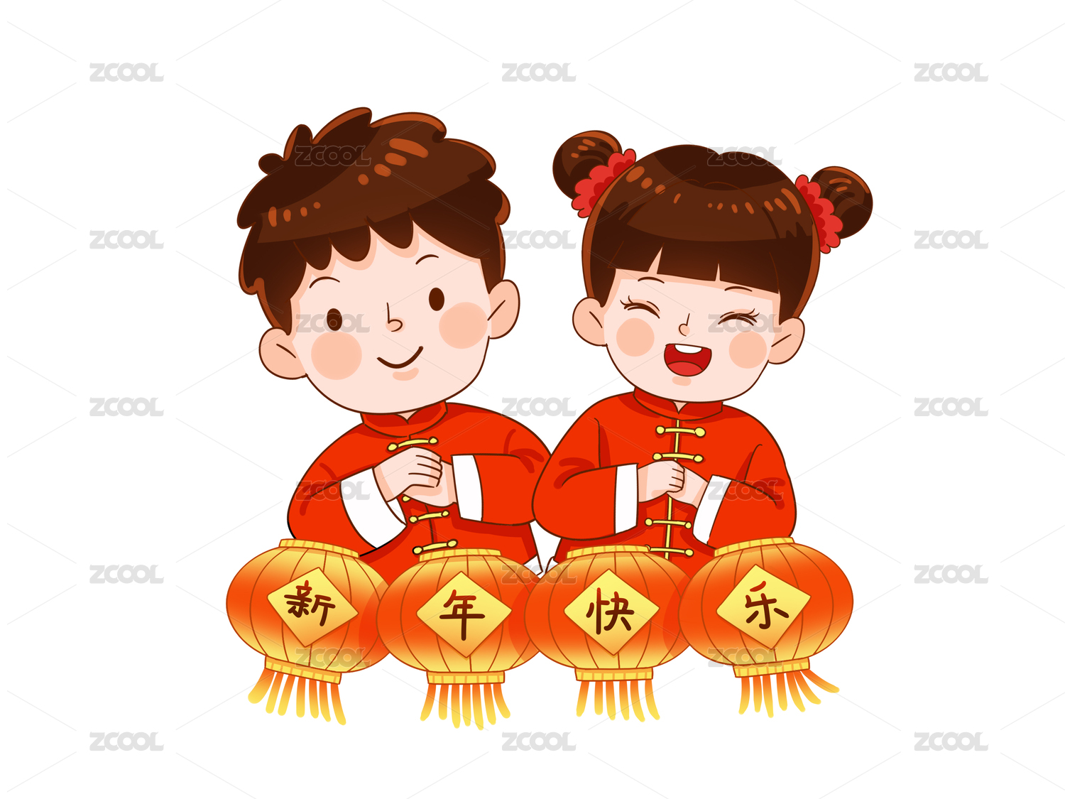 红色卡通男孩女孩喜庆拜年灯笼元素