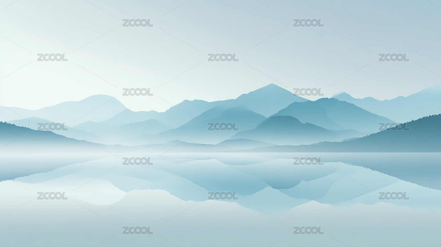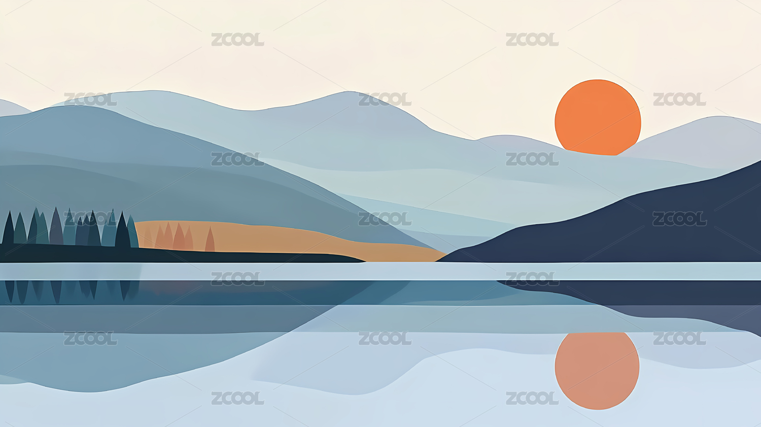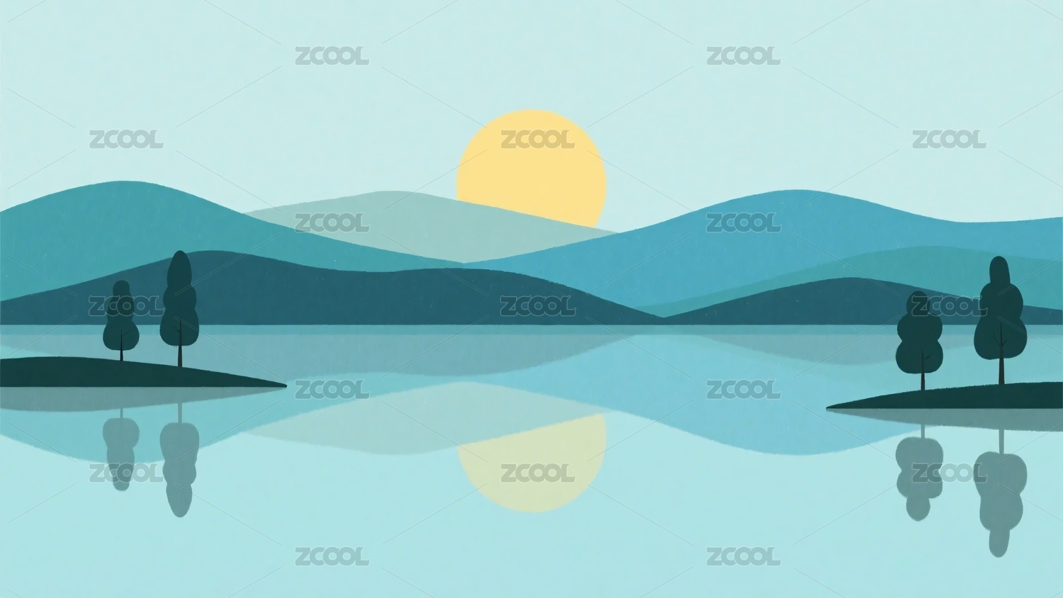 山水,湖泊,太阳,树木,倒影,插画,矢量,风景,自然,静谧