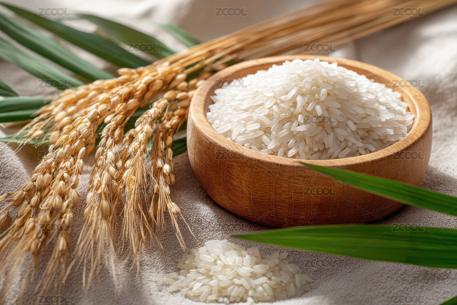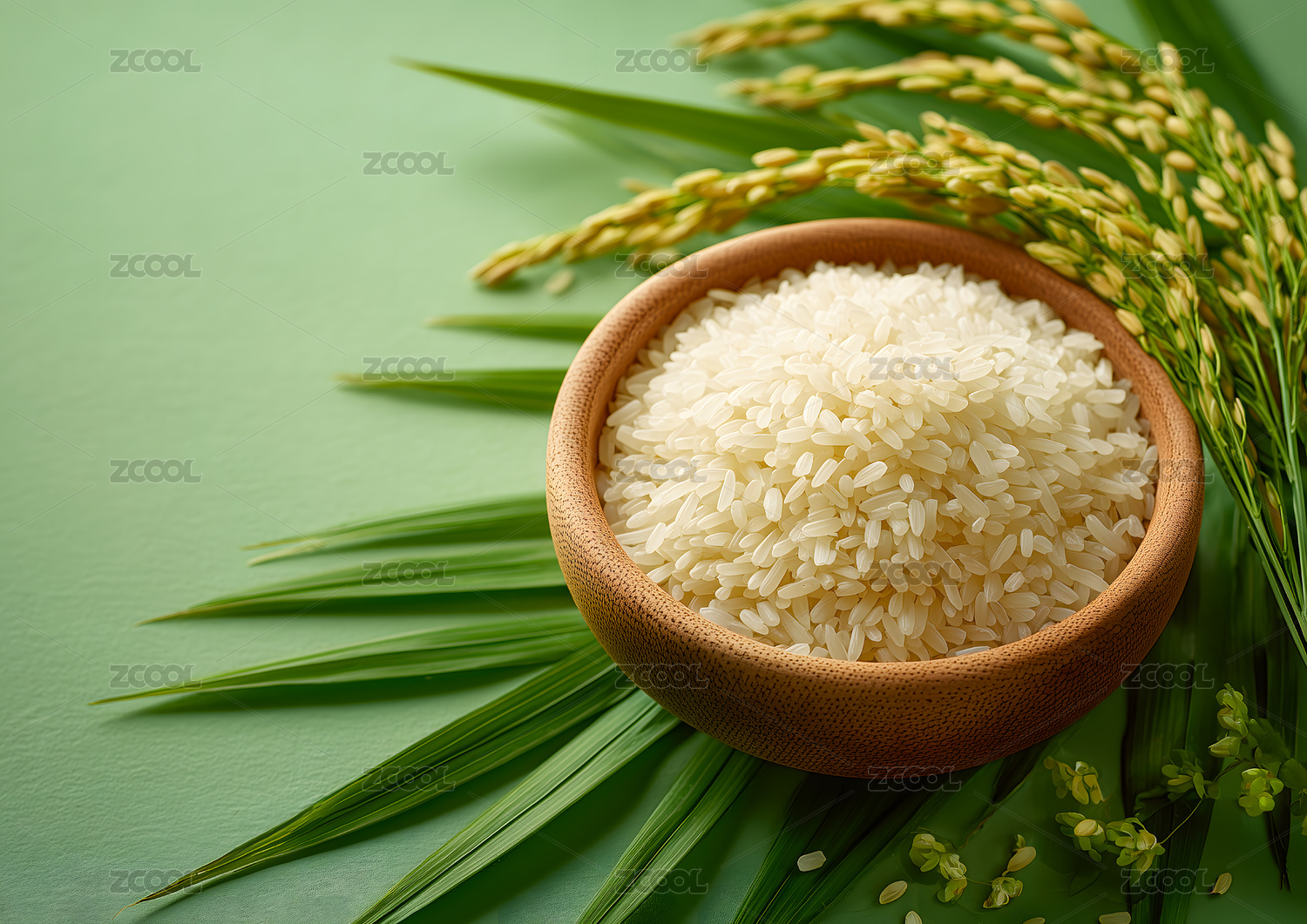 桌面上一碗大米和稻谷水稻背景,世界粮食日