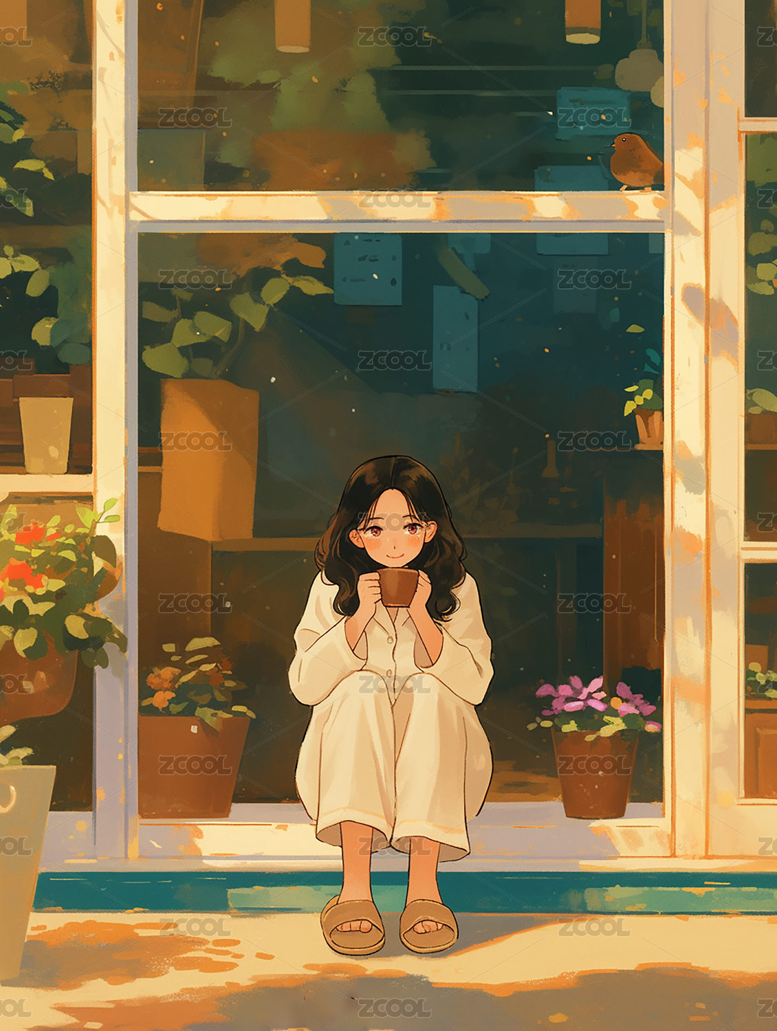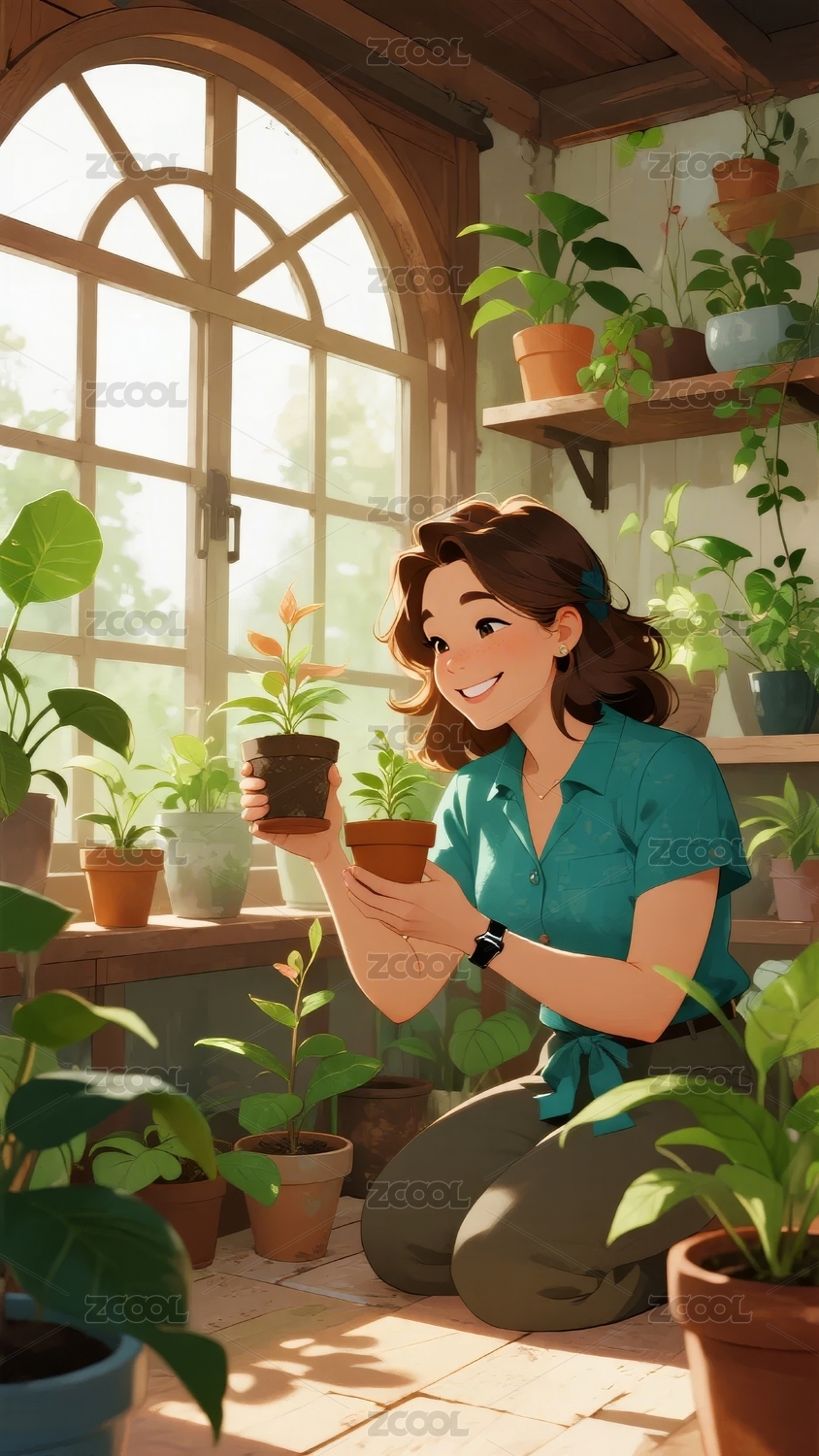阳光女孩窗边植物