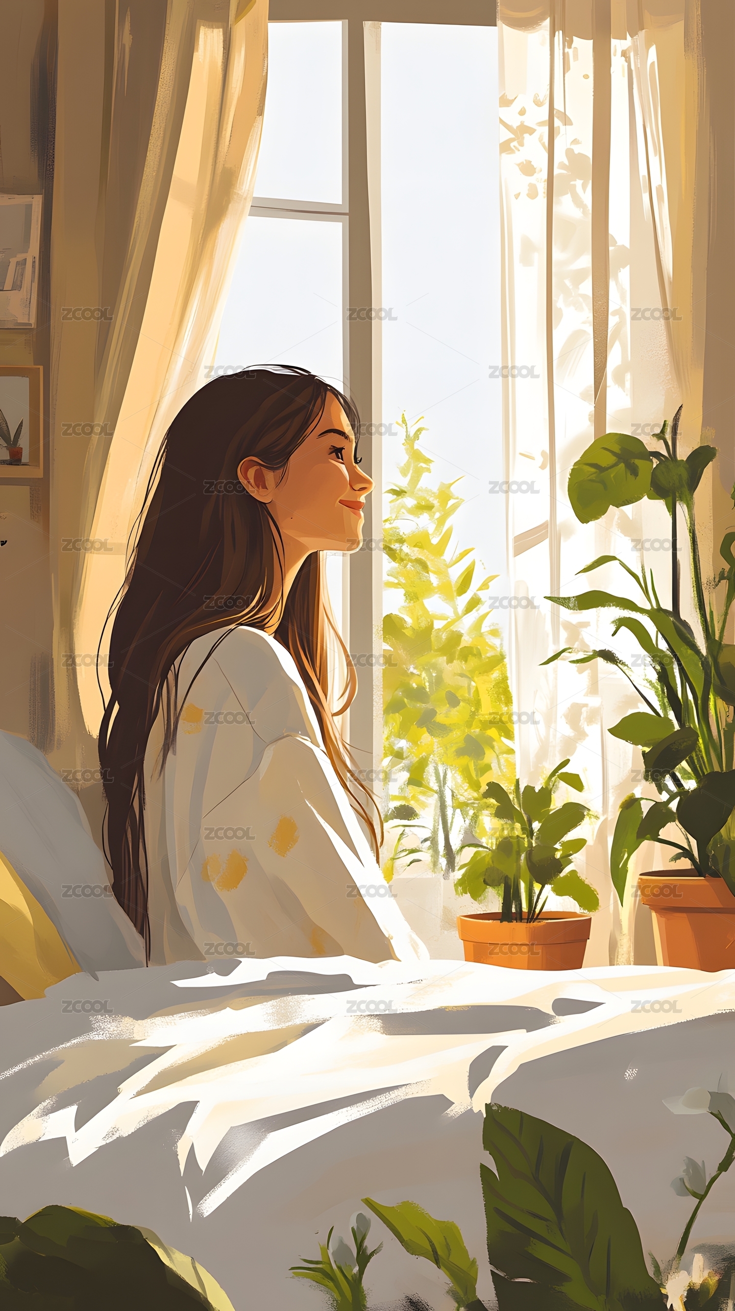 阳光洒进房间的少女